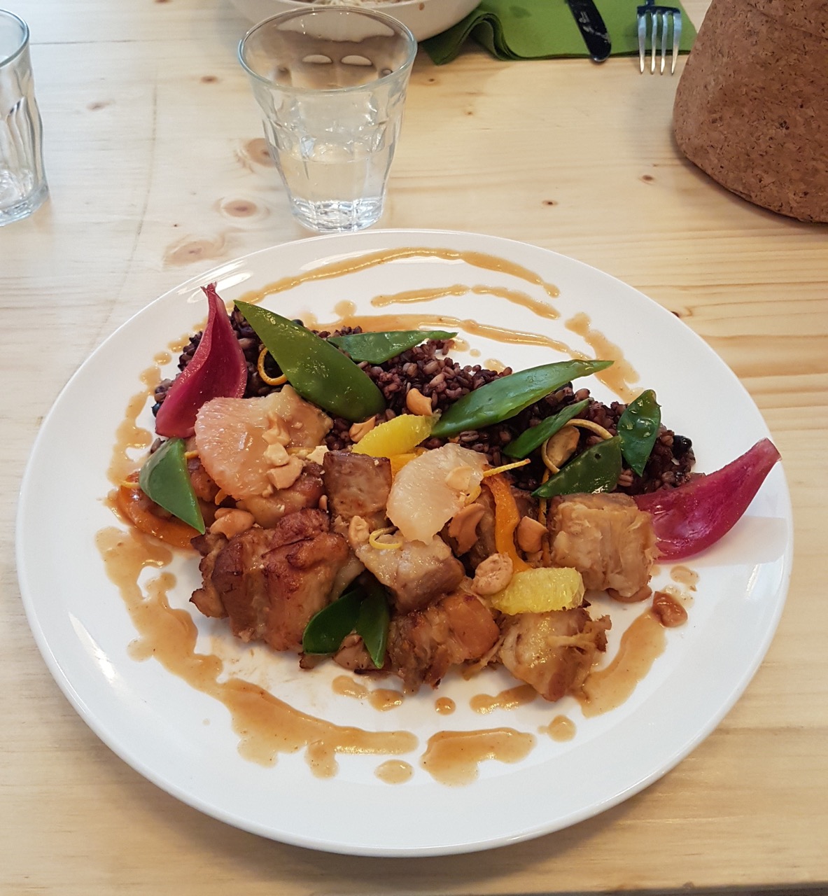 Le serveur revient, je parcours le menu du midi (plats servis de 11h45 à 14h00), et j’y découvre des plats simples, originaux et pas très chers : de 7 euros à 14 euros. Sur 6 plats, la moitié des plats sont vegan : bon point pour eux ! Pour ma part, je me dirige avec curiosité sur le Châshu de porc, shitaké et riz sauvage quant à mes collègues, il partent sur le lieu noir, croustillant aux olives noires et écrasé de pommes de terre.