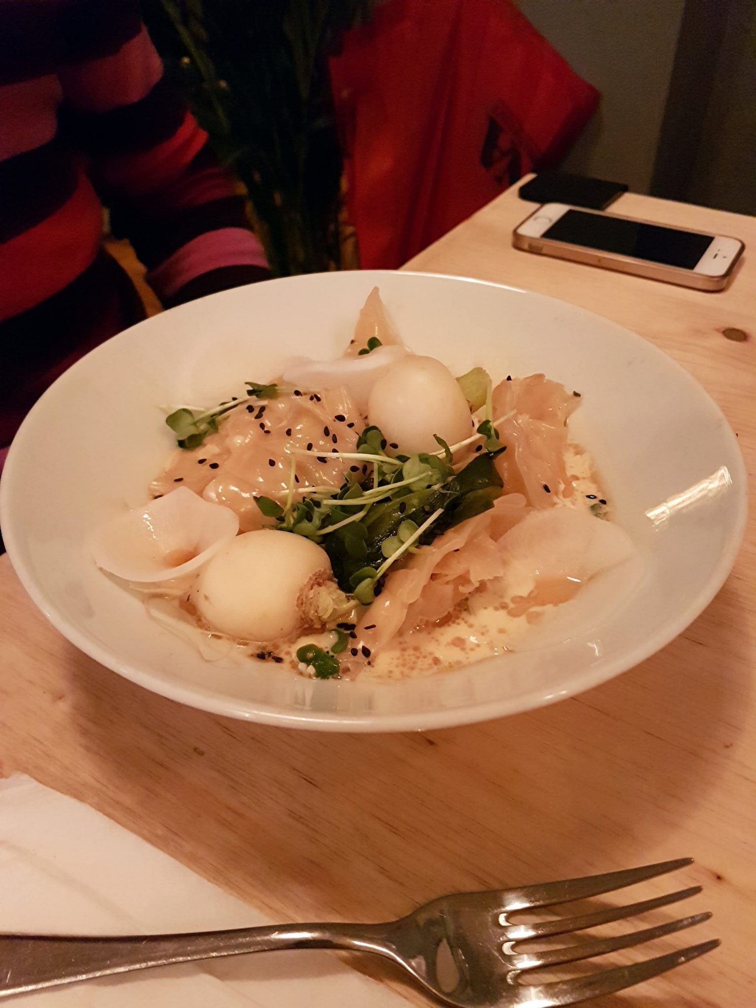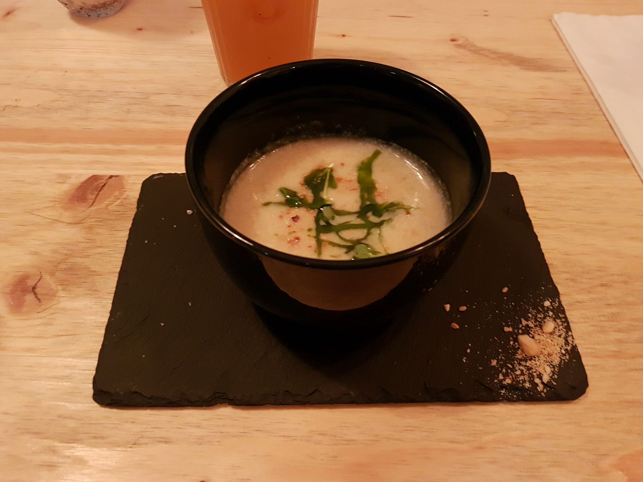 Arrivé un midi de semaine, j’ai déjà mis du temps à trouver l’endroit car il n’y a pas encore d’enseigne. Bien accueilli, je me suis posé sur une des tables de la première partie de ce restaurant tout en profondeur. On voit tout de suite que l’ambiance est soignée, calme et zen comme la musique qui passe lors du repas. On devrait passer un bon moment au calme.
