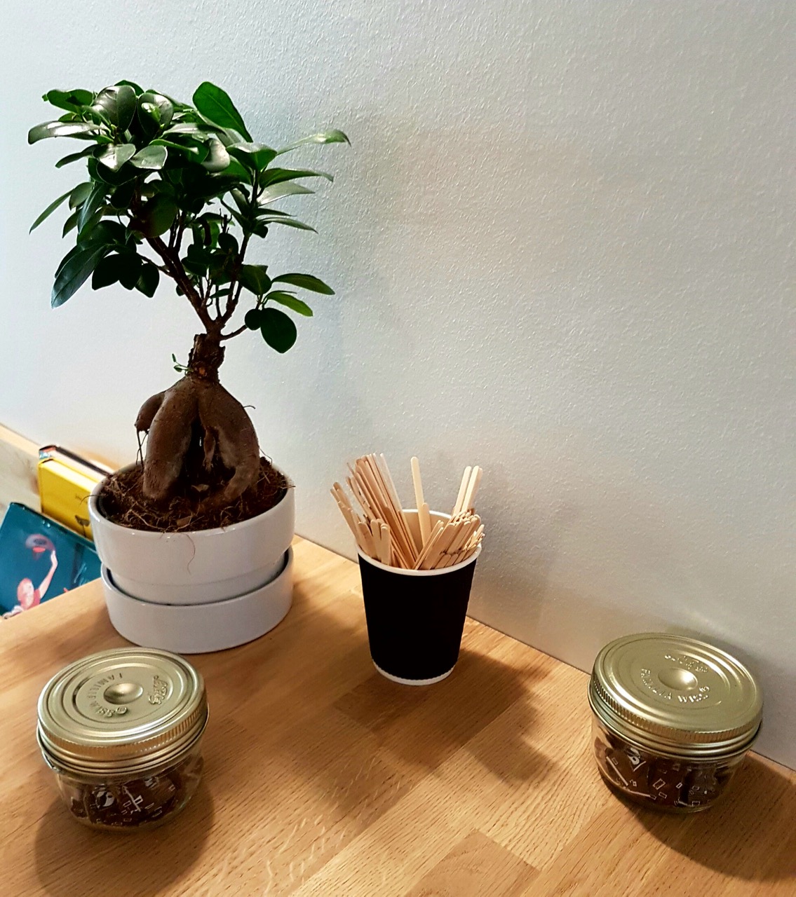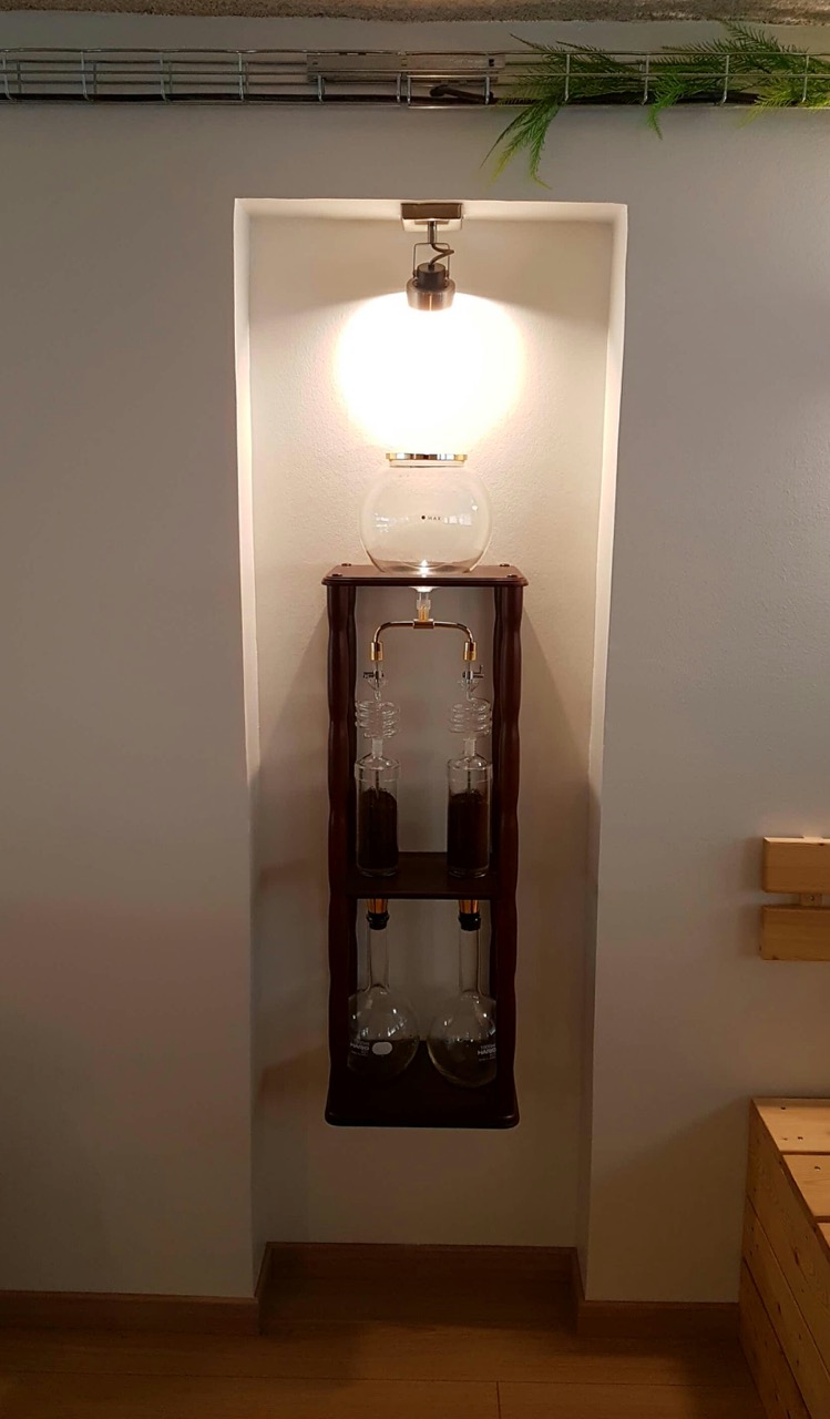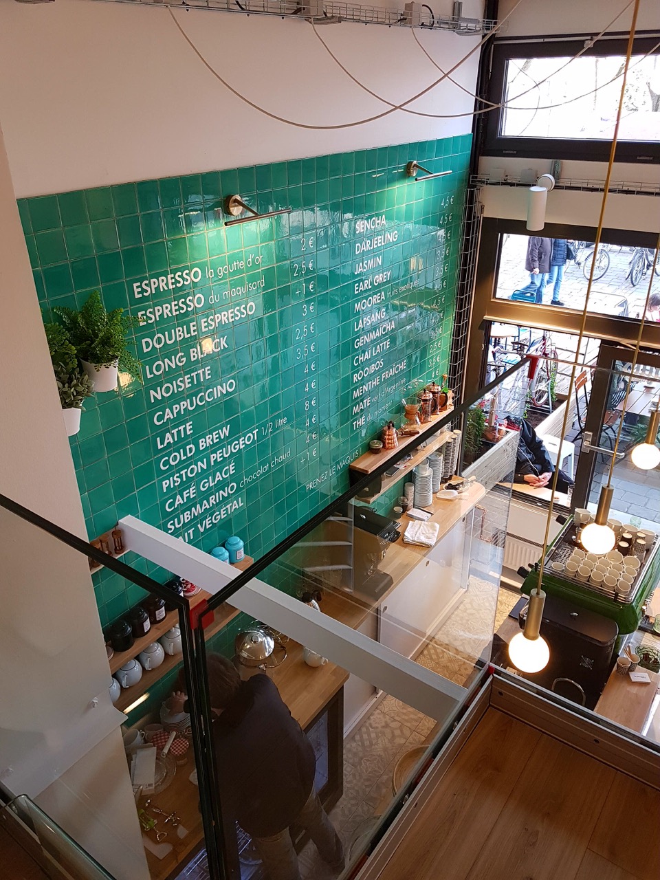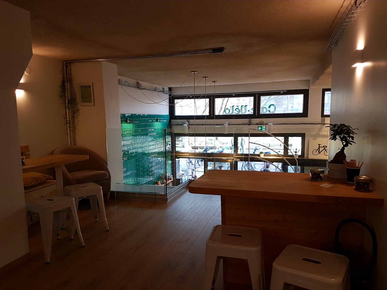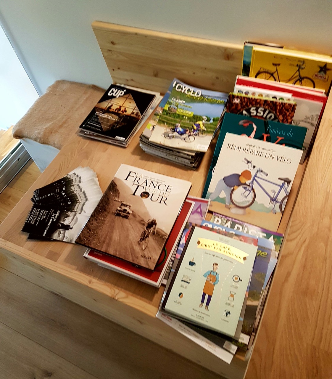 La décoration est sympa et épurée cependant, la porte grande ouverte sur l’extérieur glace un peu l’ambiance. Des petits détails sont assez marrants dans cette décoration notamment la machine d’extraction de café lente à froid et l’ouverture dans la mezzanine qui permet de voir les réparateurs en action, on se croirait presque au « zoo » du vélo ! 😉