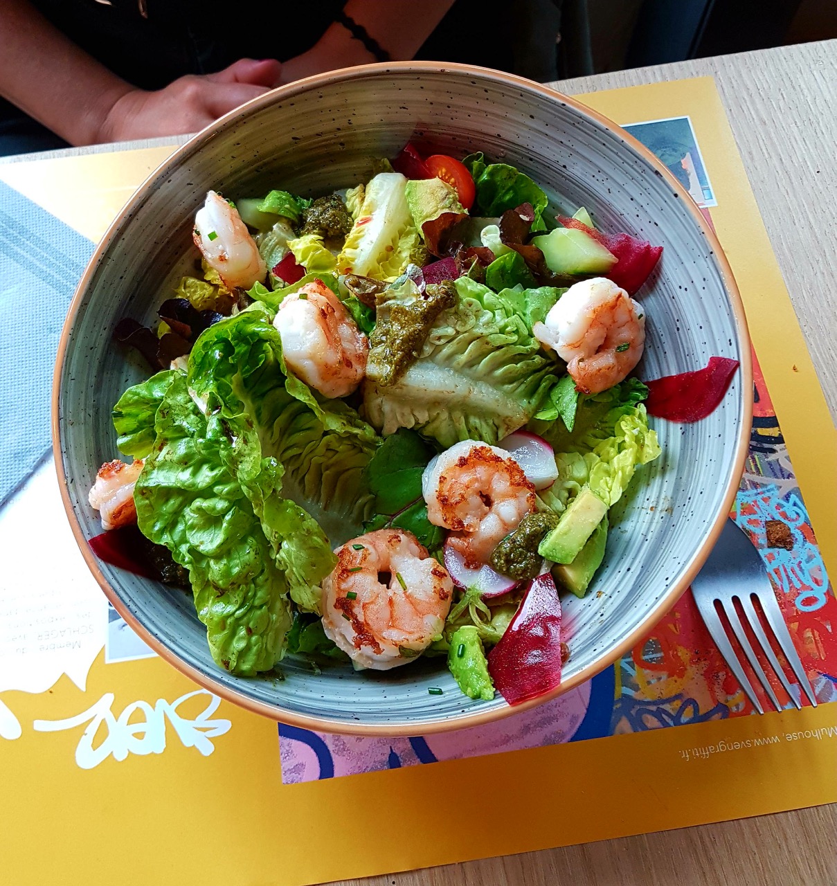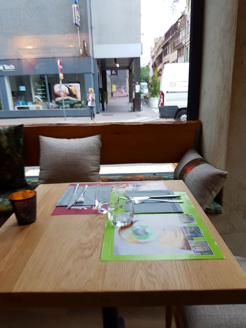 Tout d’abord, le contexte de ce test : samedi 1er juillet, 1er samedi de soldes de l’été avec une ville sous les nuages et à moitié bloquée par le dispositif pour l’hommage à Helmut Kohl qui rassemble les chefs d’états à Strasbourg. Moi, je reviens d’une semaine de congés à l’étranger, je suis pas super en forme… MAIS, j’avais hâte de découvrir alors j’y fonce pour manger un morceau. On rentre, on en prend plein les yeux de la décoration, meme si l’entrée est légèrement sombre à cause du plafond peint en noir : j’adore le mur jaune à ma gauche !