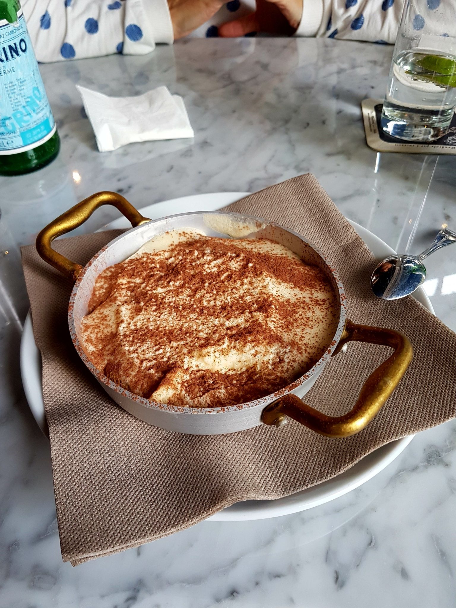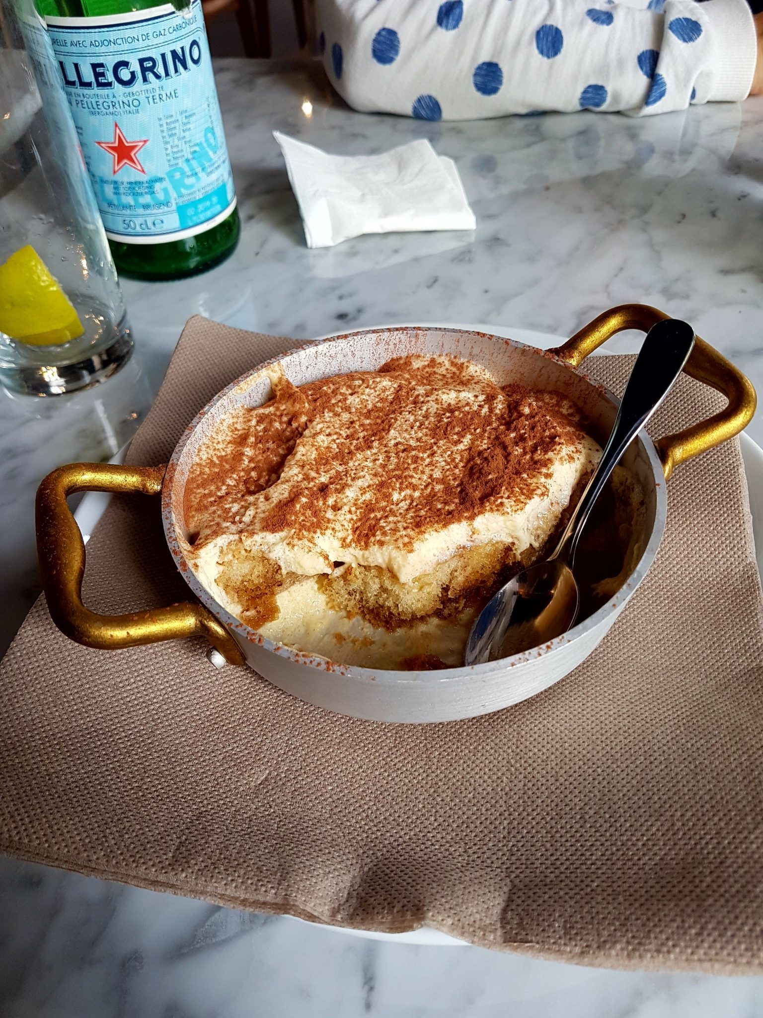 Apres avoir hésite longuement sur la carte, j’ai plutôt pris le plat de pâtes du jour( PASTA DEL GIORNO) avec panno, salsiccia, creme di tartuffo, pepe, basilico. Ma co-testeuse quant à elle est partie sur la pizza numéro 4 : Pravola fumé d’Agerola, pesto alla genovese, pancetta de cochon noir de Caserte, olives caiazzane… Si vous comme moi, vous ne parlez pas italien, normalement, vous n’avez rien compris à la phrase précédente et c’est normal: les menus sont servis avec un petit lexique qui vous traduit les ingrédients et les spécialités de chaque plat : très utile ! On a été servis rapidement, et j’ai fini mon repas avec un joli petit tiramisu servi dans un caquelon.