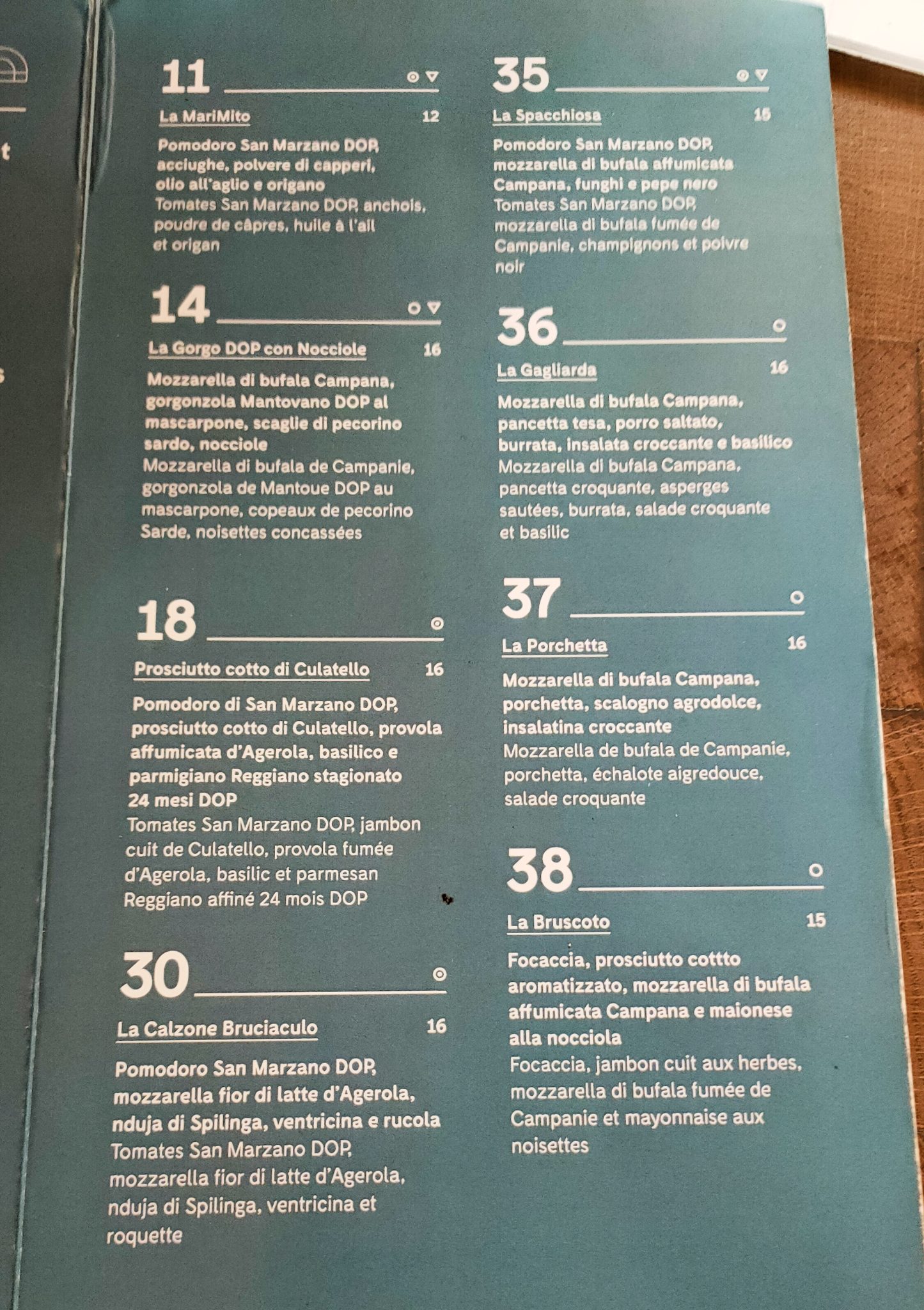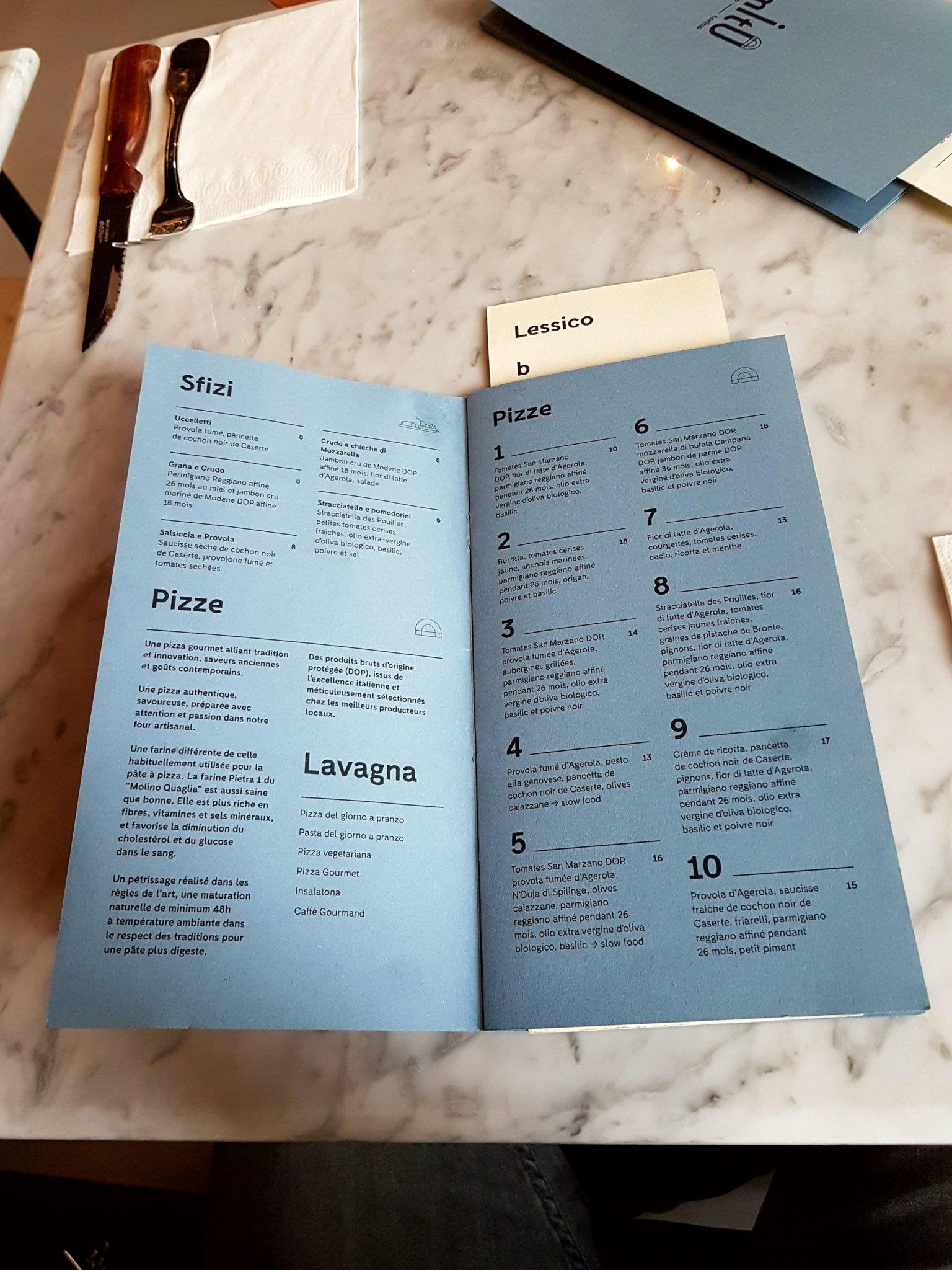 j’y étais et….j’ai du relire 5 fois la carte pour tout saisir, le glossaire n’aide pas vraiment puisqu’il y manque pas mal de termes . Par contre les prix….. la pizza est un plat populaire par excellence, comment justifier, même avec des ingrédients de qualité, de payer 18€ pour ça?????