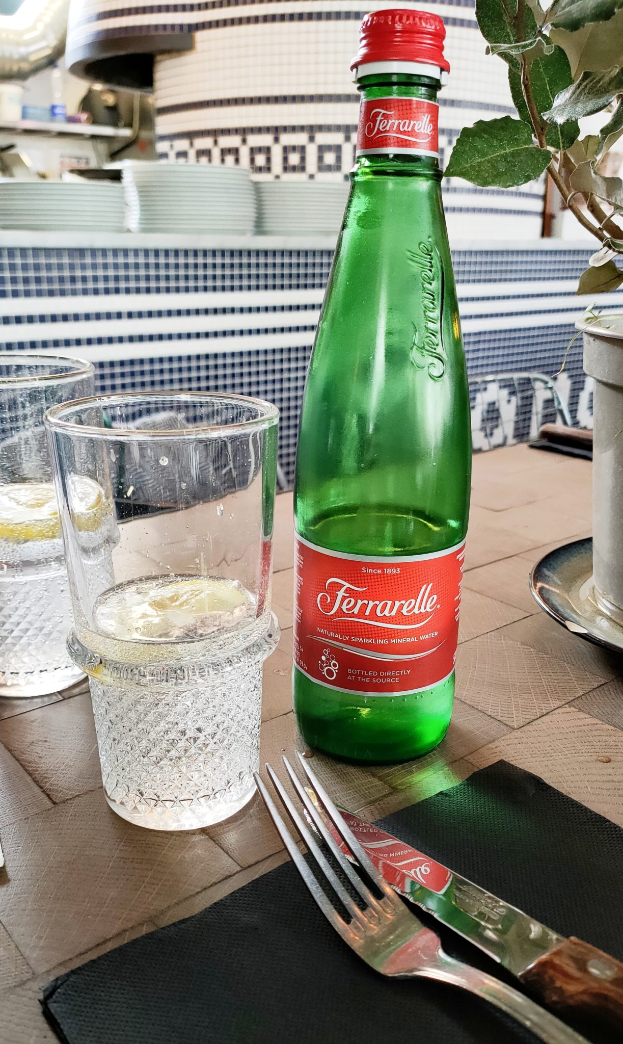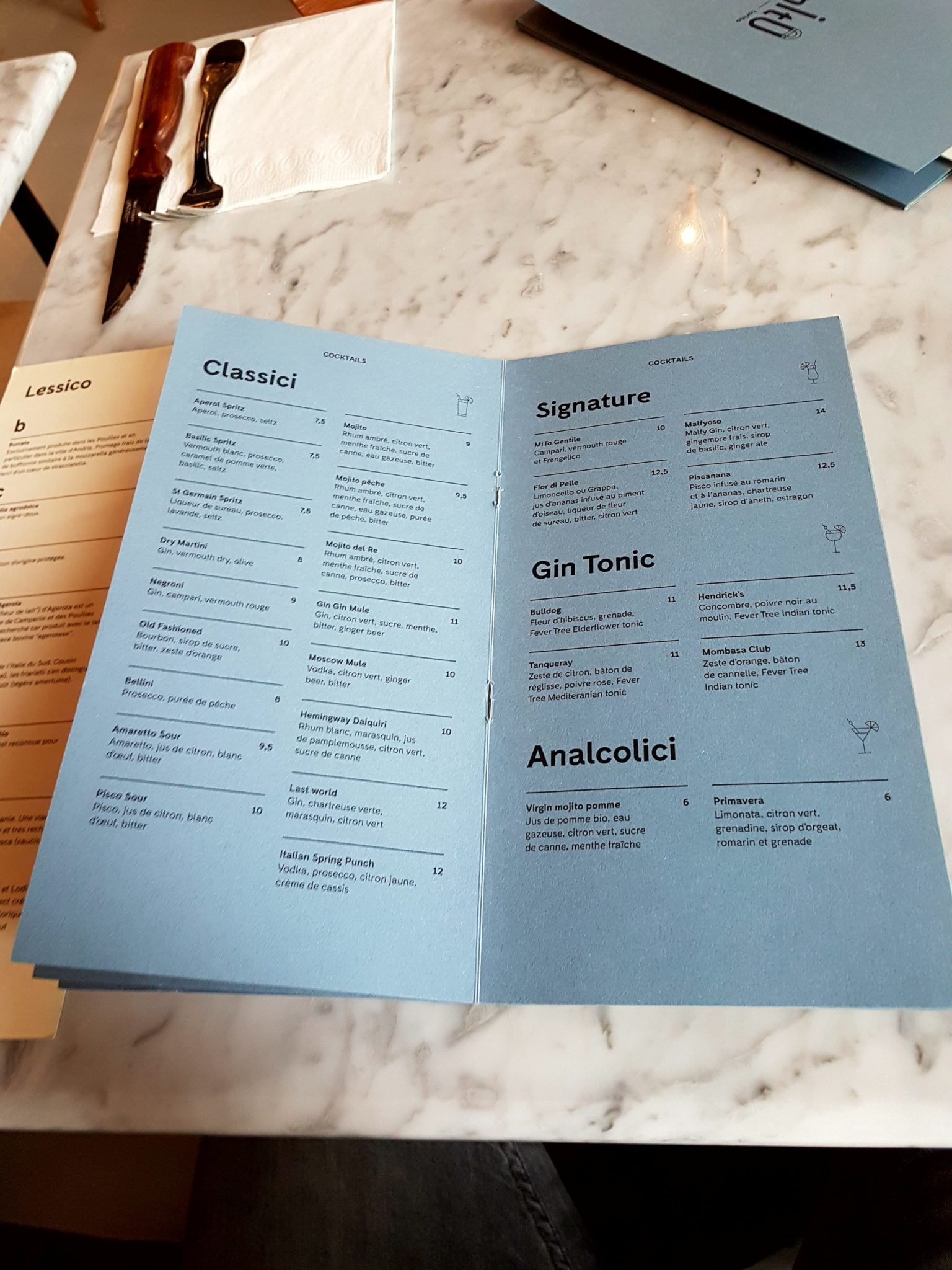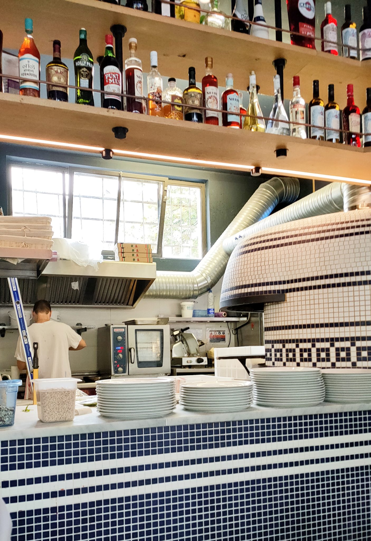 Je m’y suis installé aujourd’hui un peu avant midi pour découvrir l’endroit et goûter la fameuse cuisine. J’ai oublié la (grande) terrasse (car météo trop hasardeuse) qui donne sur la Place d’Austerlitz pour m’installer en intérieur où je pourrais profiter de la magnifique décoration bleue et blanche notamment ce bar en hauteur et les mosaïques qui ornent tout le comptoir y compris le four à pizzas. Après avoir siroté une San Pellegrino, mon amie arrive, on commande.