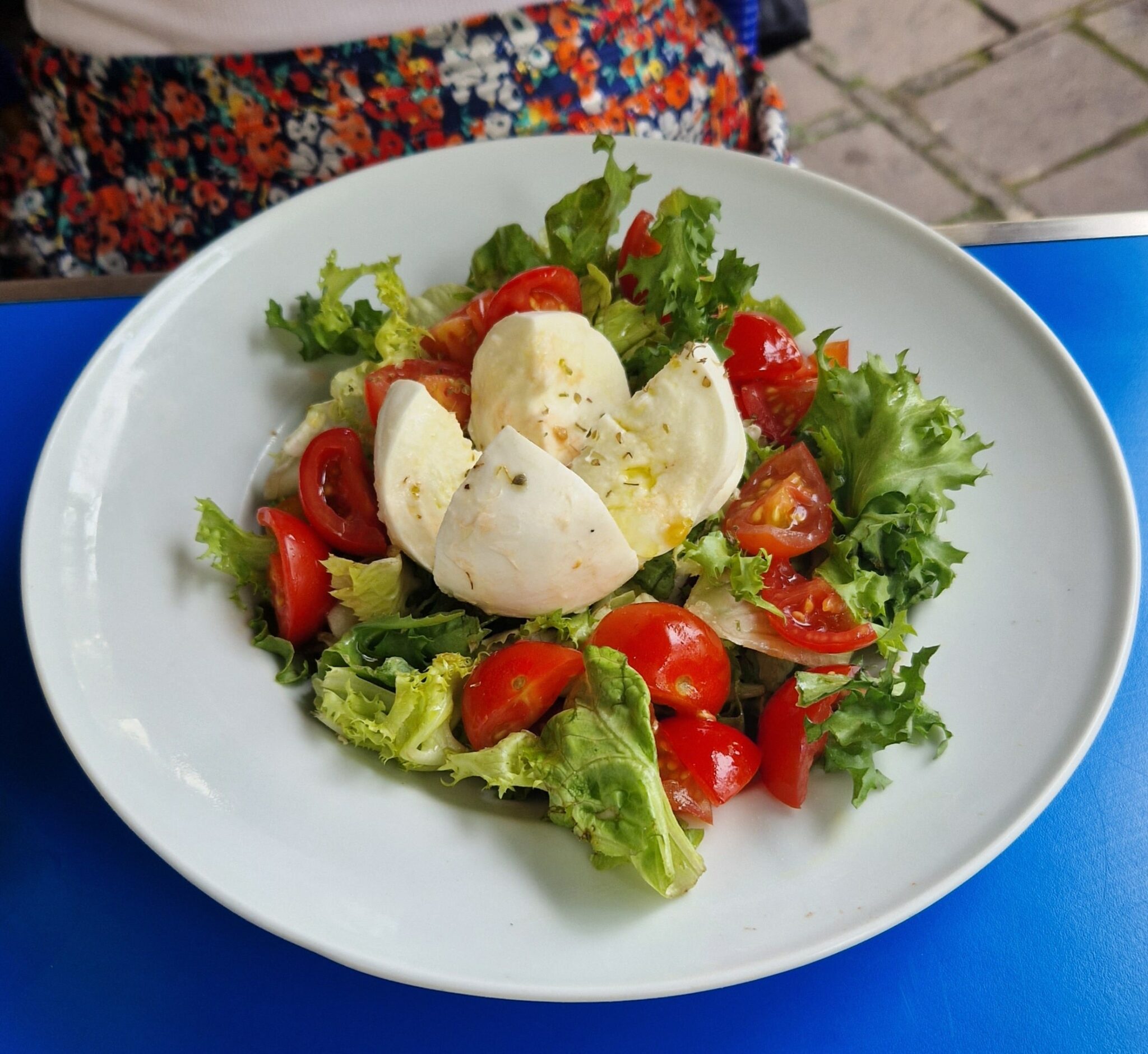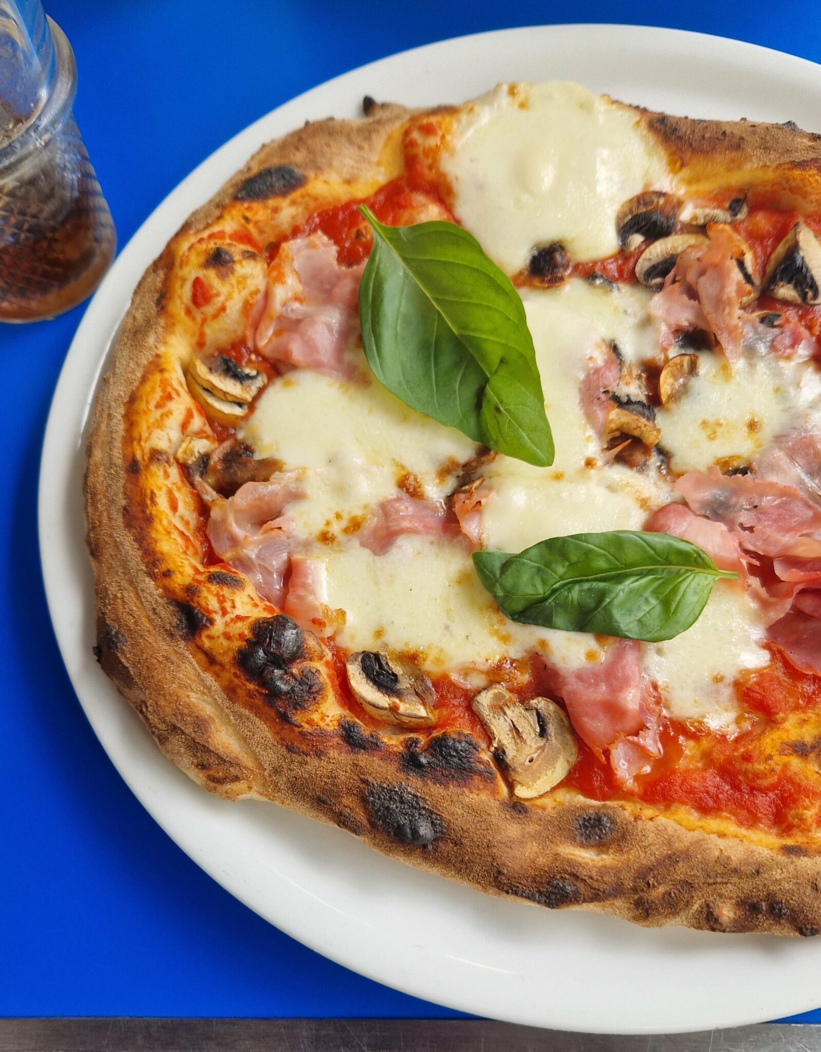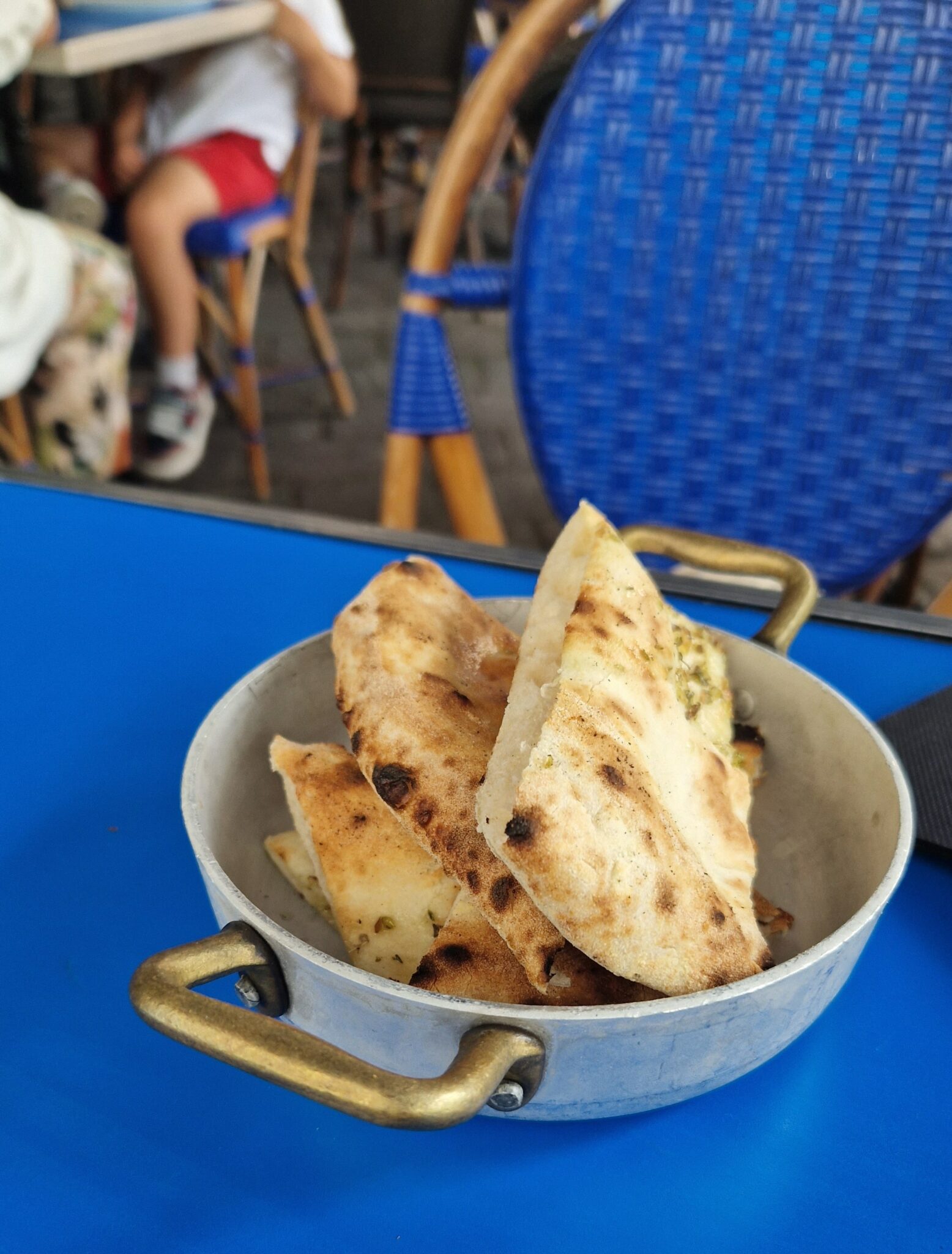 Je m’y suis installé aujourd’hui un peu avant midi pour découvrir l’endroit et goûter la fameuse cuisine. J’ai oublié la (grande) terrasse (car météo trop hasardeuse) qui donne sur la Place d’Austerlitz pour m’installer en intérieur où je pourrais profiter de la magnifique décoration bleue et blanche notamment ce bar en hauteur et les mosaïques qui ornent tout le comptoir y compris le four à pizzas. Après avoir siroté une San Pellegrino, mon amie arrive, on commande.