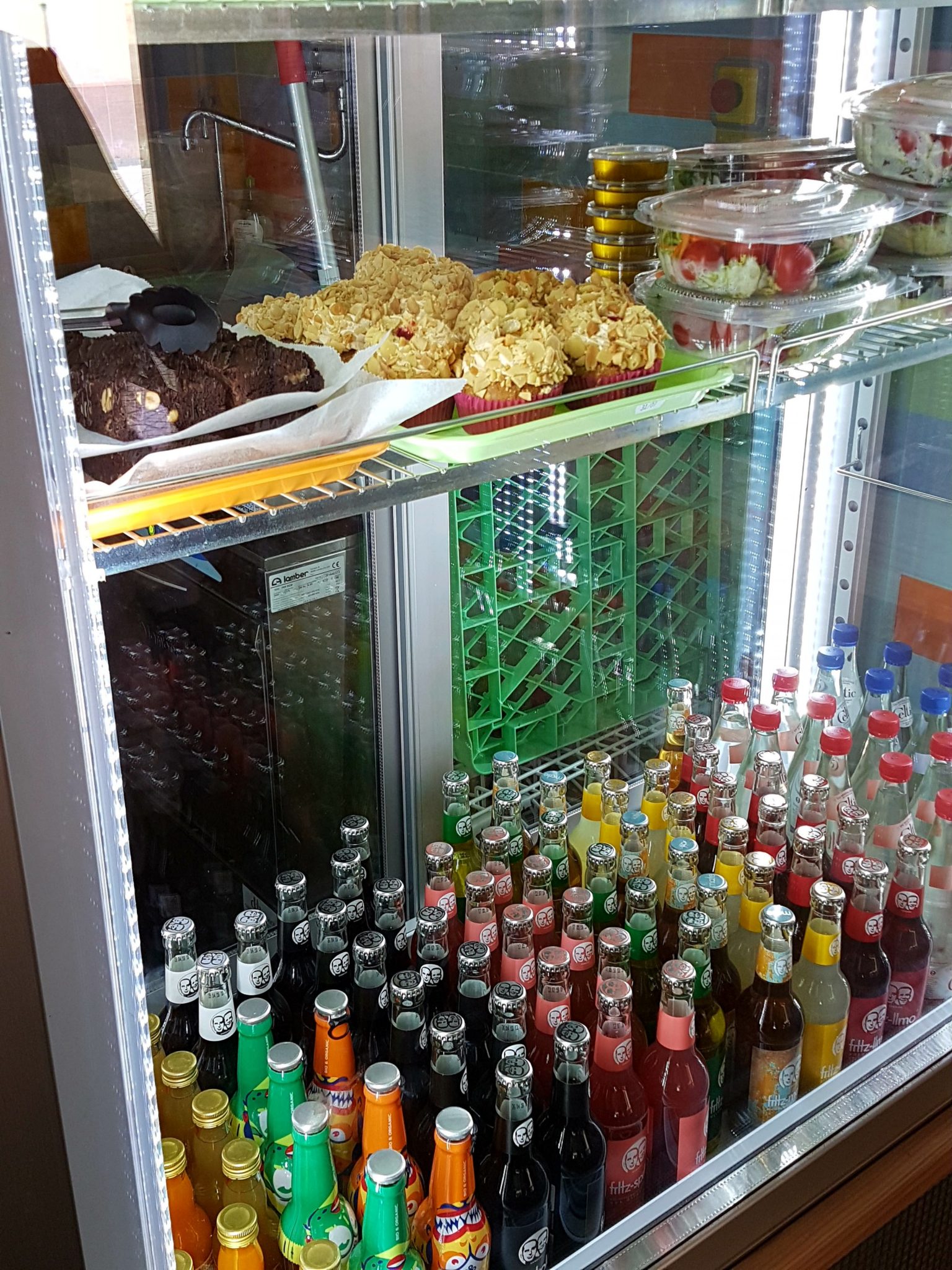Je passe ma commande , après un accueil un peu « sec » de la serveuse, je choisis un menu : ITALIAN burger (fromage vegan, crème pistou maison, tomates séchées, courgettes marinées, roquette, oignons, cornichons, salade et « steak »), des frites et une boisson (Fritz Cola, cola vegan allemand). Je m’installe au fond de la classe et j’attaque le repas ! Les frites sont bonnes, le burger aussi, la pain au sésame est frais mais avec un peu trop de graines à mon gout, ce qui cache le gout des ingrédients.