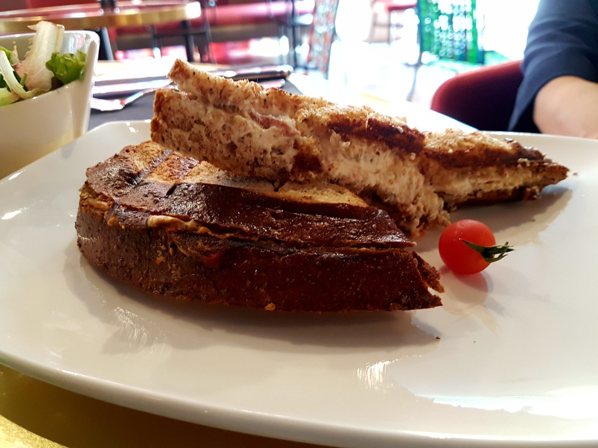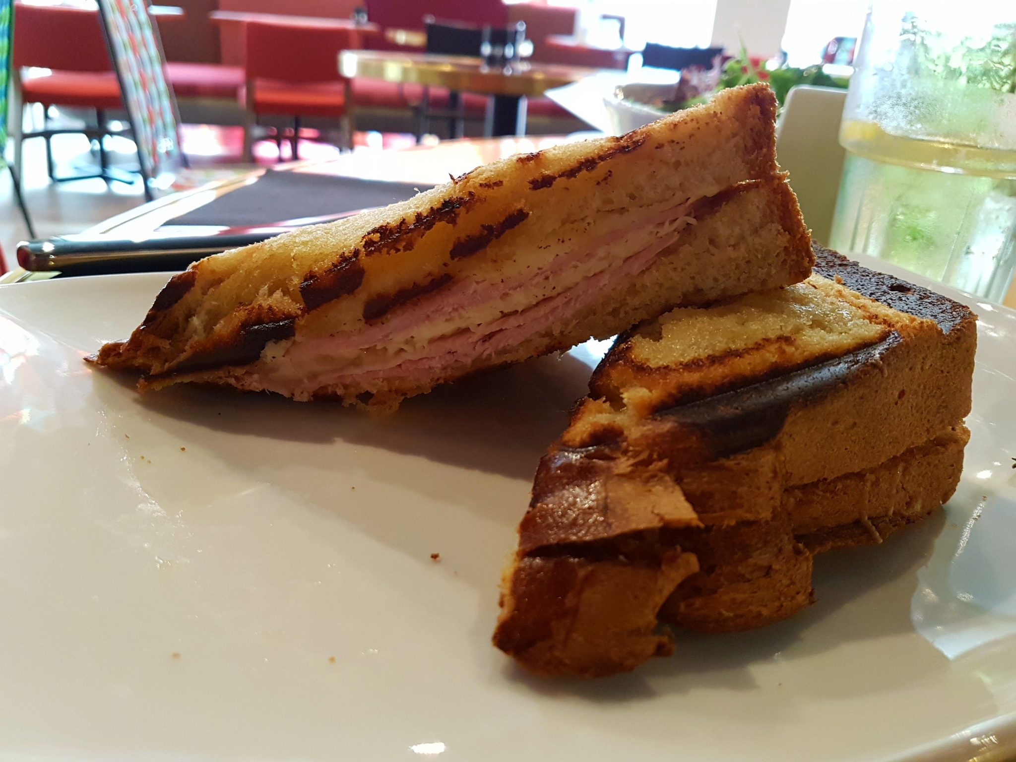 Tout d’abord, on est venu sans réservation, les mains dans les poches. On nous a installé rapidement à une table centrale, on avait le choix vu qu’on était seuls ! On a pris un moment avant de commander pour apprécier la magnifique décoration : du parquet au mobilier on en a pris plein les yeux… Dommage par contre que les rideaux cachent la vue de la rue et assombrissent l’ambiance générale du restaurant. On passe commande, à la carte il n’y a que des croque-monsieur : 3 différents, ça tombe bien, on était 3 ! On reçoit d’abord notre boisson, on discute, ça met du temps à arriver… Et tada, nos 3 croques massifs arrivent à table accompagnés chacun d’une salade (bien assaisonnée, classique mais bonne). On est surpris par la présentation un peu sommaire des plats, mais on déguste avec appétit. Le pain de mie bio (élaborés par Thierry Schwartz) des croque-monsieur ressemble beaucoup à une brioche, c’est surprenant mais on s’y fait. On finit nos plats et par curiosité plus que par appétit, on commande des desserts…