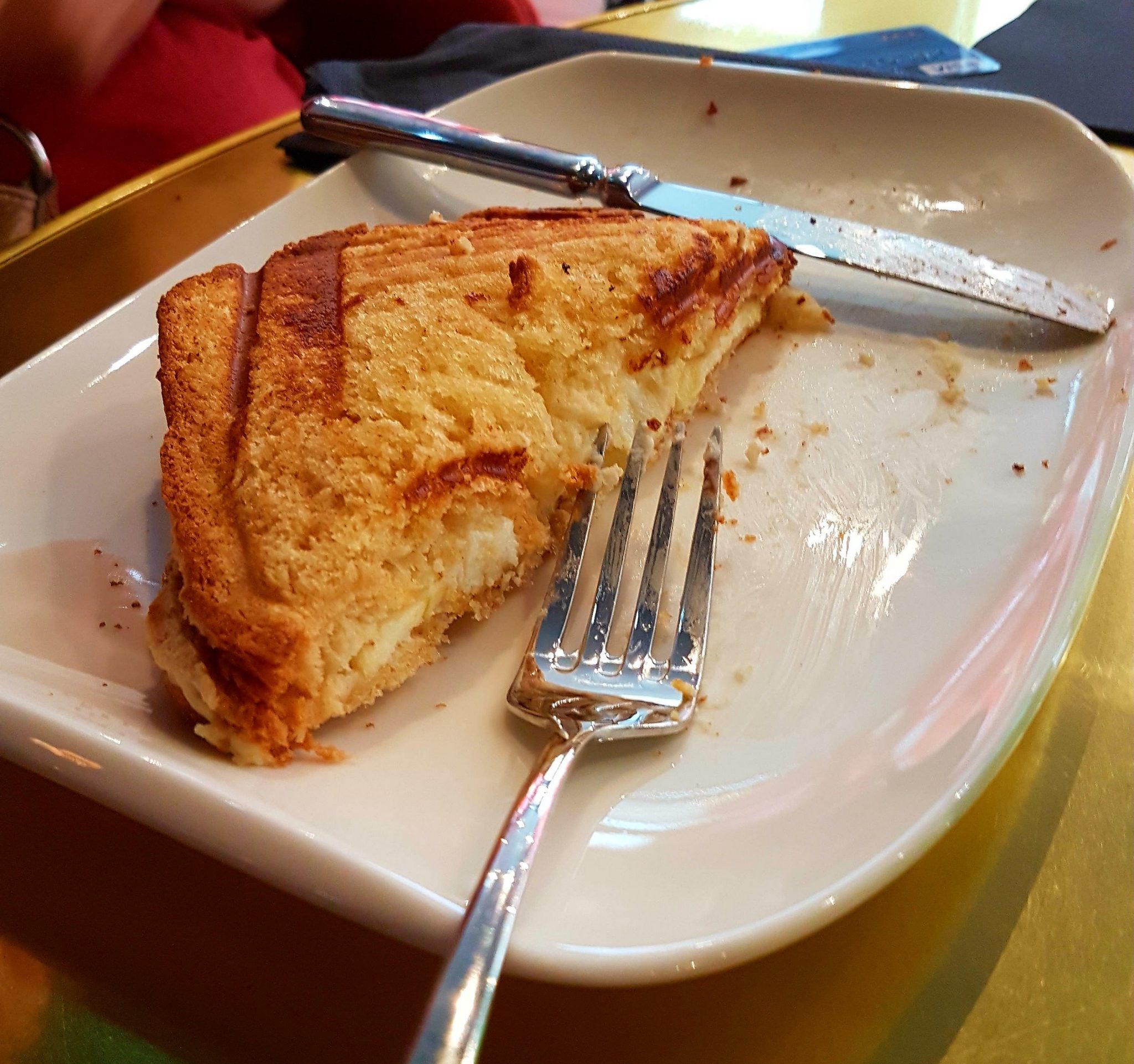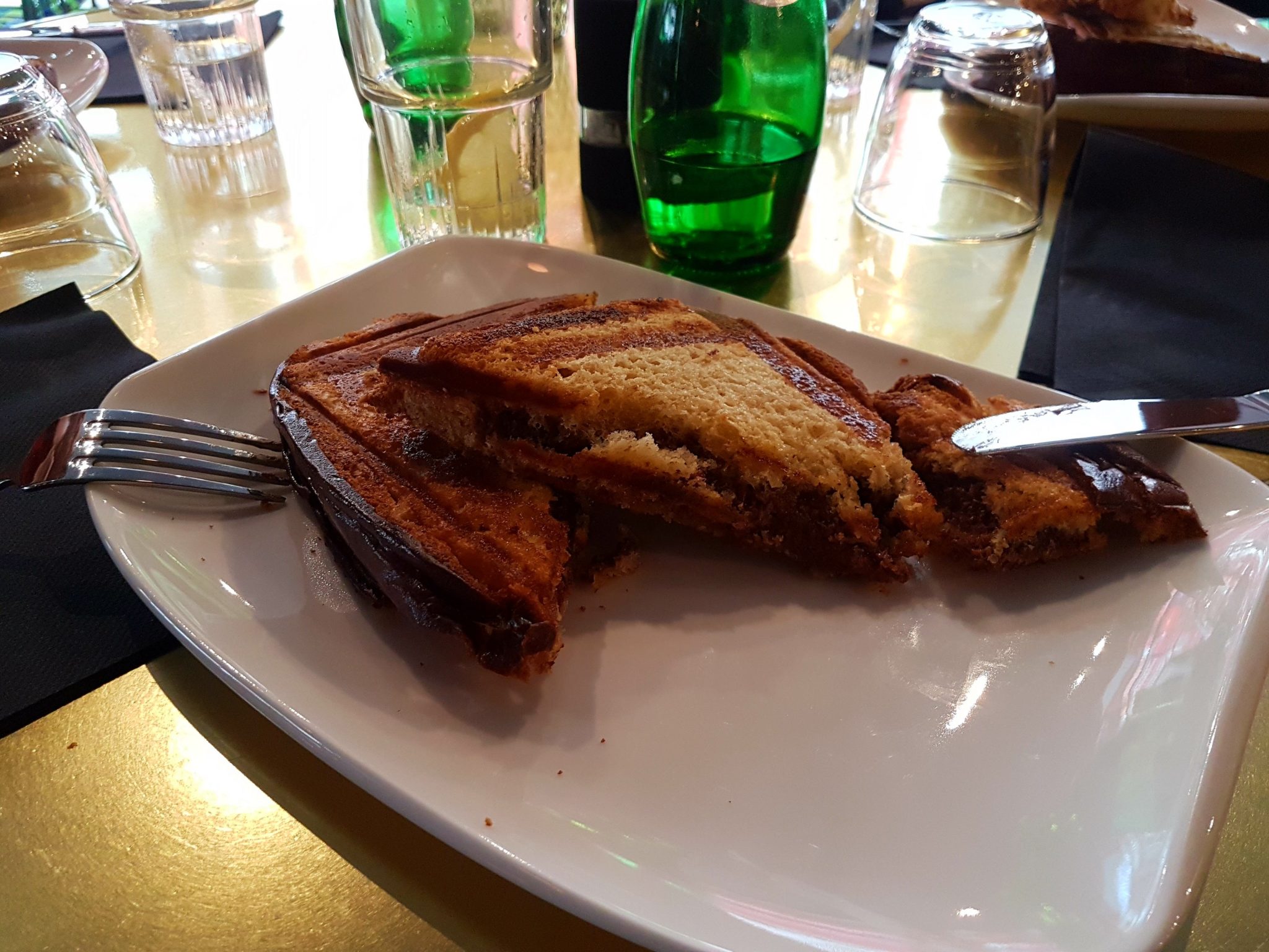 Quelques minutes plus tard, les desserts arrivent et là… C’est la surprise : la serveuse arrive avec la copie conforme des croque-monsieur servis en tant que plats, mais avec une garniture sucrée à chaque fois. A vrai dire, on s’attendait à autre chose : plus petit, plus fin, plus joli…? Une petite boule de glace ? Une touche fruitée..? Bah non, c’était juste des croque-monsieur version dessert. Autant vous dire qu’on a chacun lutté pour finir nos desserts, on a pas réussi du tout, on a à peine mangé la moitié car c’était trop : trop bourratif, trop gras… Même plus de place pour prendre un café, on a réglé et on est partis…
