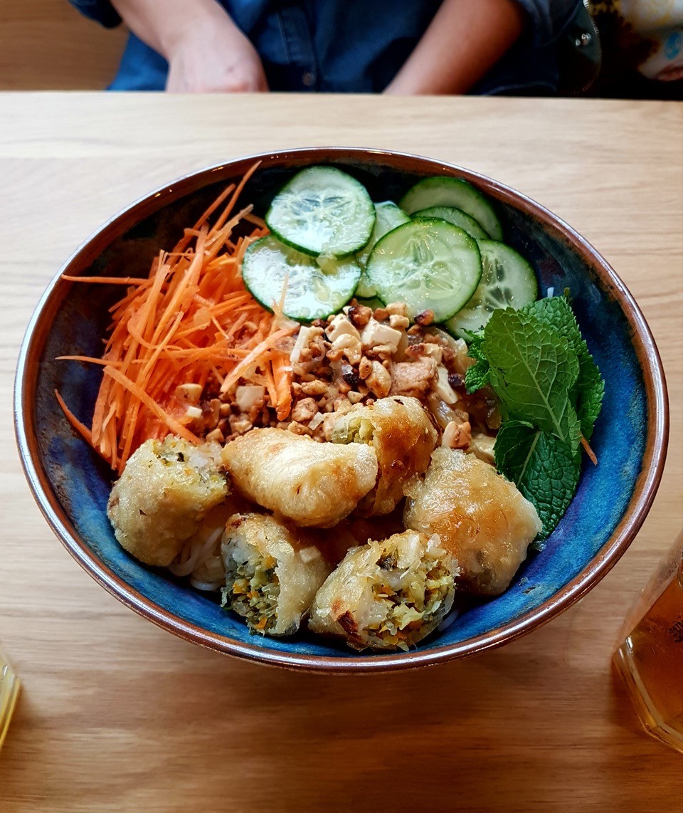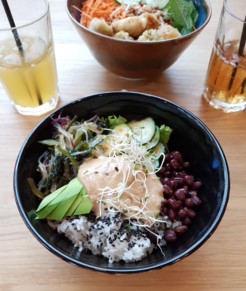 Je suis arrivé assez tôt, j’ai pu me poser sans problème… Par contre, ça s’est remplit assez vite, je ne pensais pas que l’endroit avait déjà autant d’adeptes ! La salle est claire, grâce à ses grandes baies vitrées et ce, malgré une météo de septembre 2017 assez maussade ! L’ambiance est boisée avec quelques touches de verdures, ce qui donne un coté zen à l’ensemble : on est bien posés ici ! On a commandé nos deux bowls : un Tokyo bowl avec concombres, salade, haricots azuki, avocat et riz et un K-bowl avec la même base de riz mais avec patates douces, chou, et tofu… tout ça accompagné de deux thés glacés faits maisons. Pour le dessert, j’ai pris un pudding aux graines de chia et banane coco : excellent !