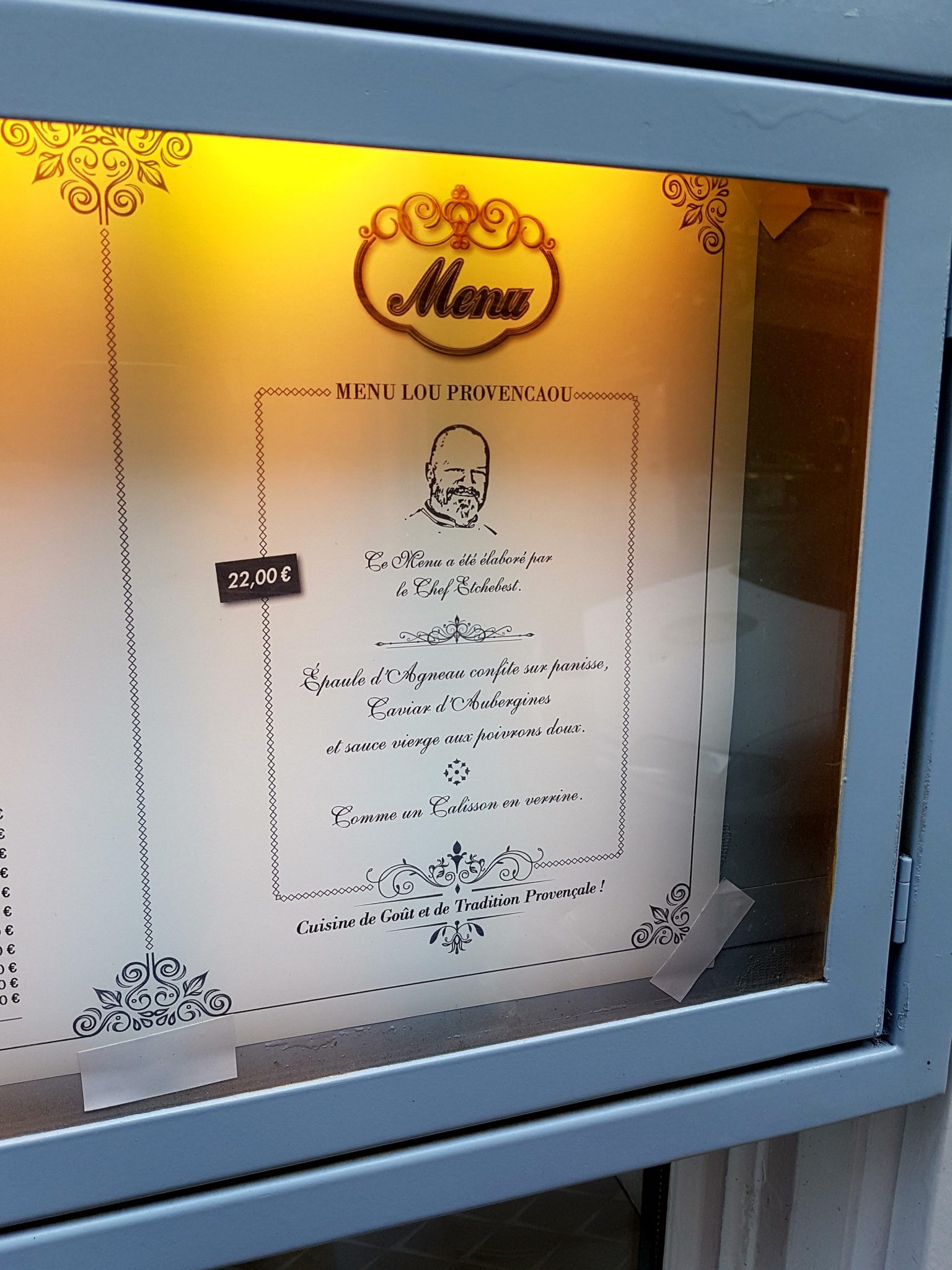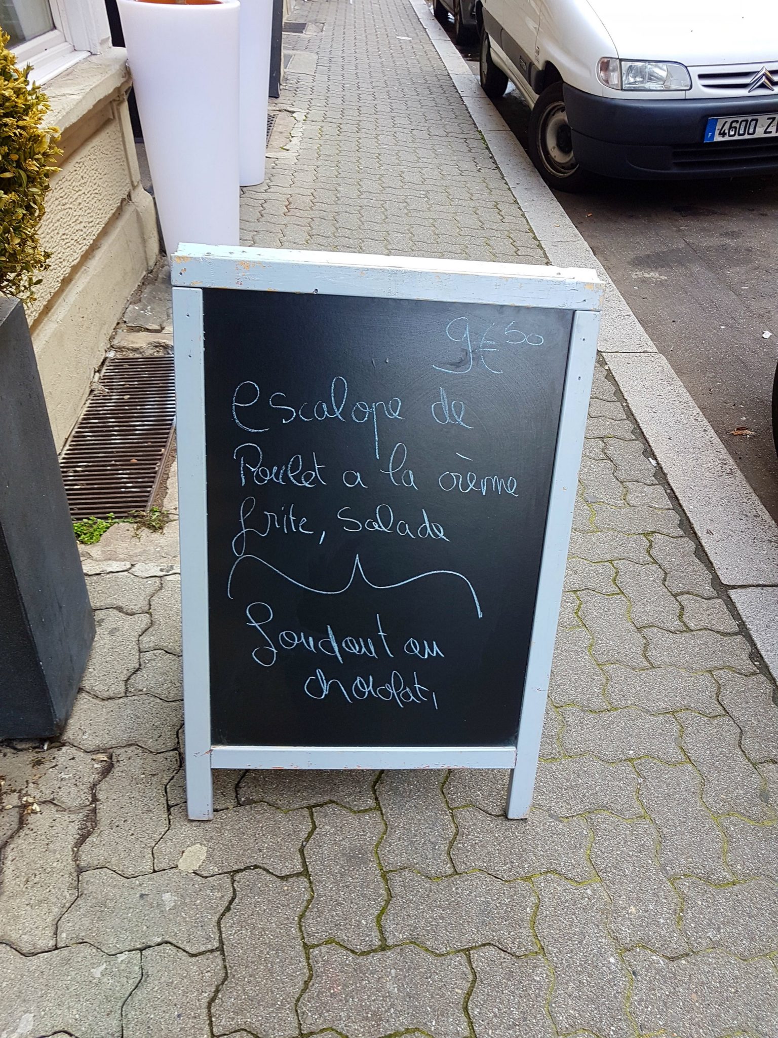 J’ai donc mangé là-bas, vite fait un midi de cette semaine, décidé à goûter le menu qui a été concocté lors de l’émission… J’ai réussi à réserver rapidement, je pensais que le restaurant allait être plein, mais ce n’était pas le cas. Je ne suis pas vraiment fan de la cuisine provençale, mais pour autant, je ne peux pas dire que je n’aime pas : tout simplement, je ne la connais pas assez ! De toute façon, peu importe, puisque j’ai même pas choisi, j’ai directement pris le menu Etchebest à 22€ : plat + dessert ! Impossible de le louper, il est placardé dehors et sur les menus… De plus, je dois avouer que le plat du jour ne me tentais pas trop : escalope de poulet à la crème avec des frites avec un fondant au chocolat en dessert (on n’avait pas dit “cuisine provençale” ?)