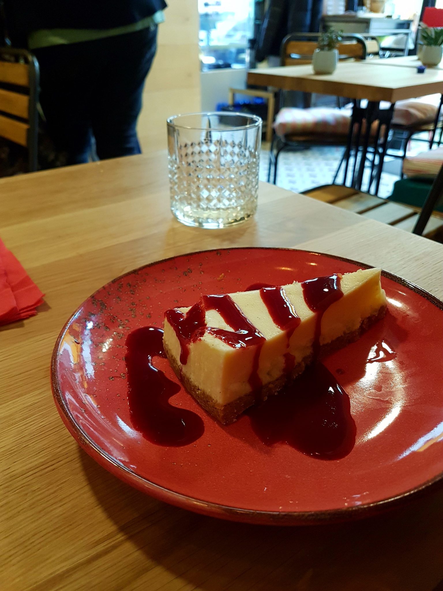 On passe au dessert. De mon coté une tarte aux pommes noyée dans la crème anglaise et du côté de ma collègue un cheesecake. Là aussi, c’est la cata : pour moi la tarte aux pommes était loin d’être fraîche et la pâte est pas bonne. Quant au cheesecake, dur, pas du tout appétissant, il avait du rester lui aussi un peu trop longtemps au frigo…