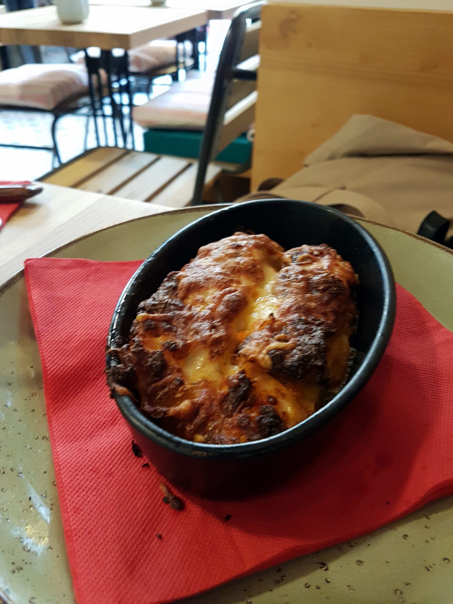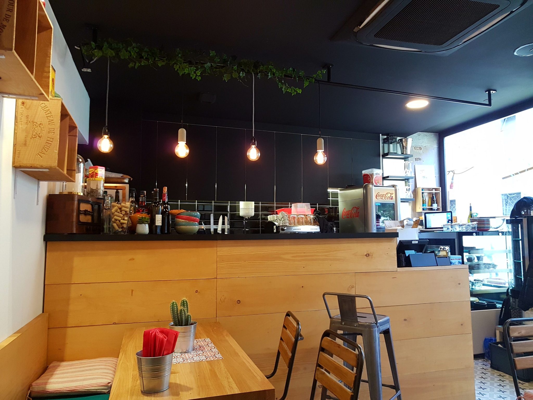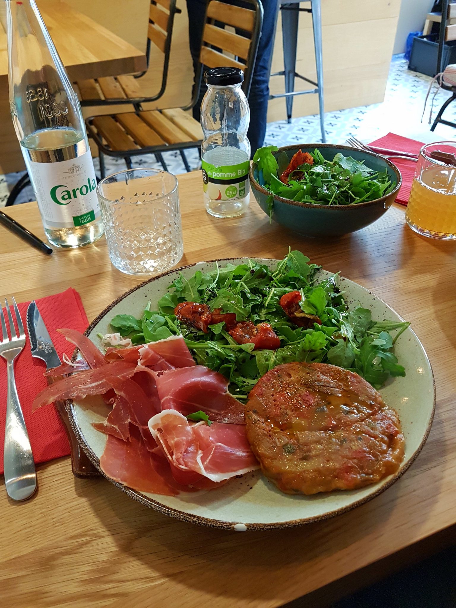 A vrai dire de dehors, on ne sait pas trop ce que c’est : la terrasse est sympa mais y a rien expliqué à part un menu imprimé sur une feuille A4. On s’installe à l’intérieur car malgré quelques rayons de soleil, l’air reste frais pour manger dehors. Le gérant / serveur Achour (ancien gérant du bar du TNS), nous accueille avec l’air enjoué et de bonne humeur. On parcourt la carte et c’est assez difficile de choisir, on peut pas dire que les plats nous emballent… Je pars sur un tatin de légumes et son jambon serrano roquette tomates, ma co-luncheuse s’attaque quant à elle aux lasagnes saumon estragon toujours servies avec de la salade. Une boisson chacun, on déguste nos plats…