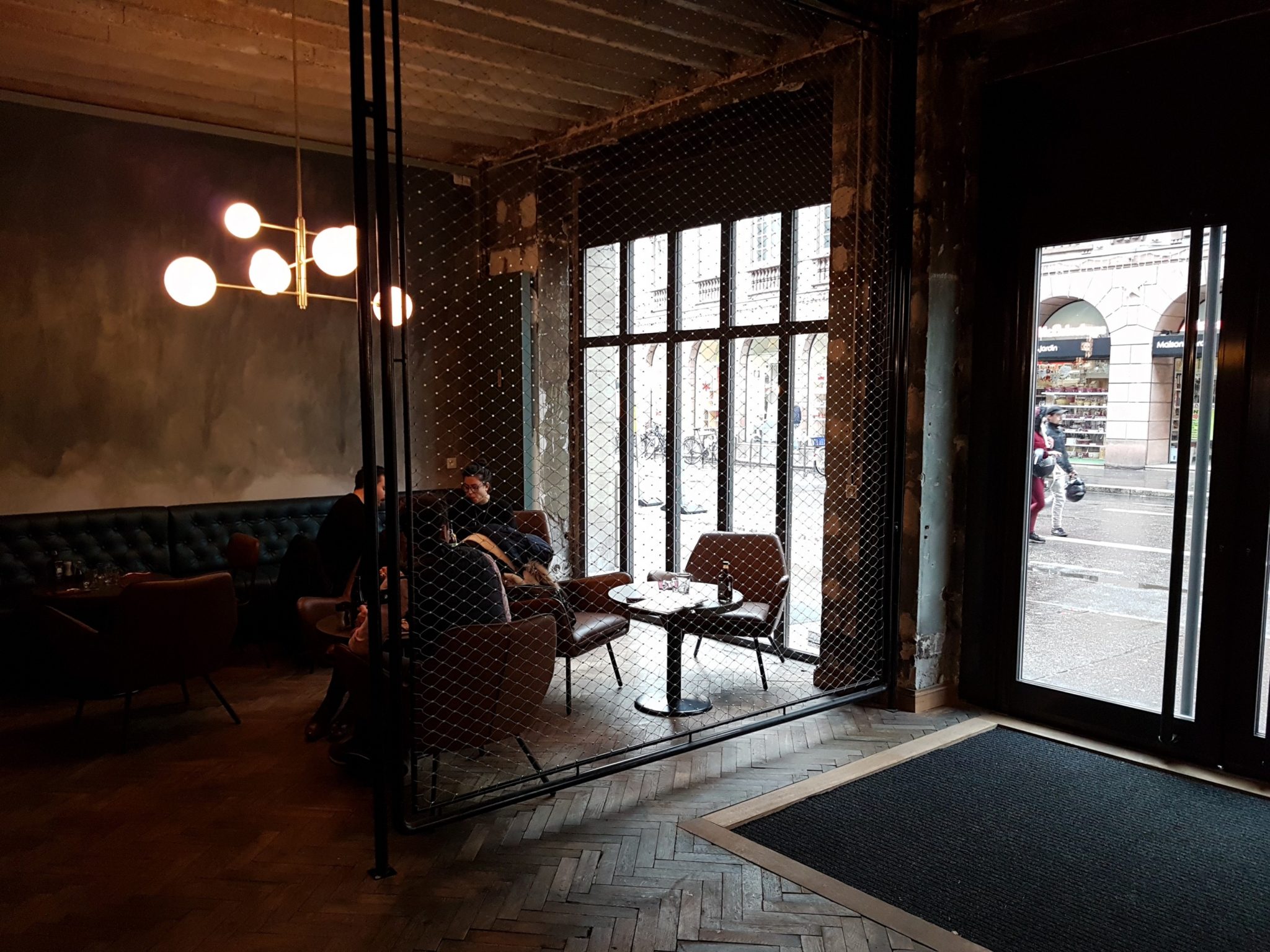 J’y suis allé un samedi midi, en fin de service, la salle (du bas) était bien remplie, on a pu se poser sur la grande table donnant sur la verrière et la coure arrière. Ambiance assez sympa car la lumière du jour nous éclairait un peu (malgré la météo maussade), le reste de la salle restant assez sombre… D’ailleurs je ne suis resté qu’au RDC, j’aurai du aller faire un tour au 1er étage pour voir la décoration…