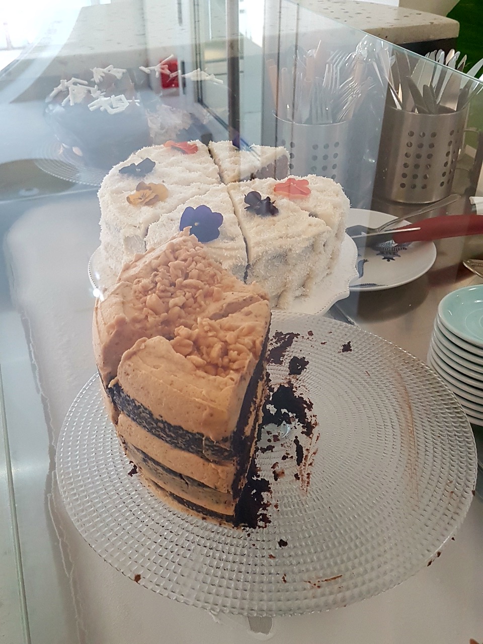 J’y suis allée pour le goûter et pour me faire plaisir avec une bonne pâtisserie. J’ai goûté le gâteau chocolat beurre de cacahouète et sirop d’erable. Le paradis ! C’etait Excellent! Et encore, je n’ai demandé que la moitié d’une part. À côté, je me suis régalée avec un tchaï latte au lait d’amande.