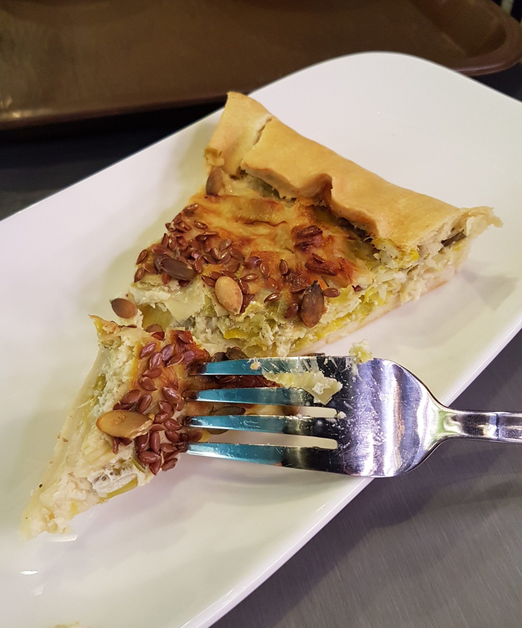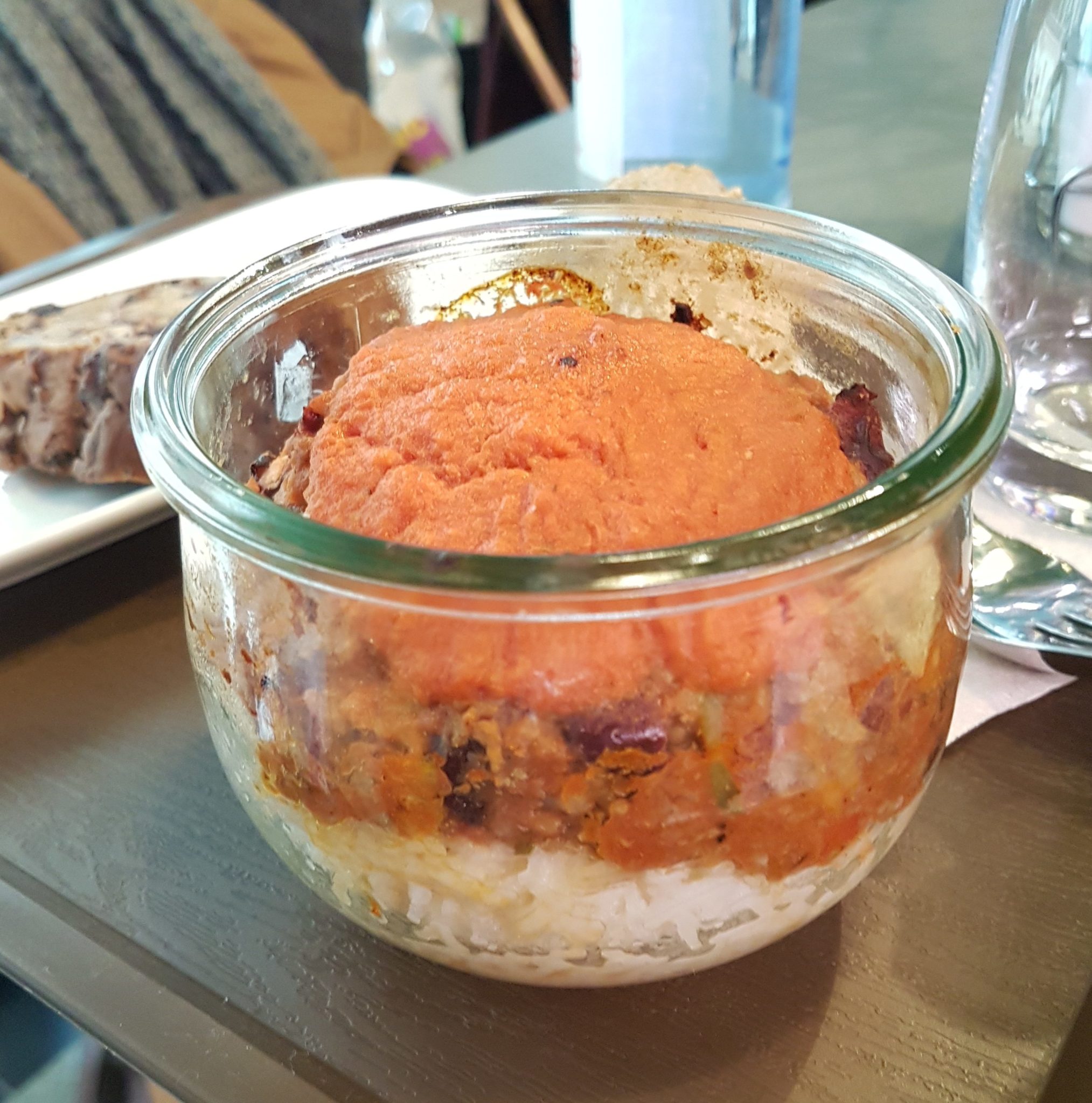 Au niveau du menu : on peut manger un bocal seul (plat de 400 grammes) pour 7€50, ou entrée + plat à 10€90, plat +dessert à 10€90 ou entrée + plat + dessert à 13€90. Ce qui est correct par rapport à la concurrence au centre ville. J’ai pris la formule la plus complète : Tarte aux poireaux en entrée, Chili con carne en plat principal et une part de gâteau au chocolat banane en dessert. La personne qui m’accompagnait avec juste pris un plat vegan : Gratin de butternut + tofu + graines.