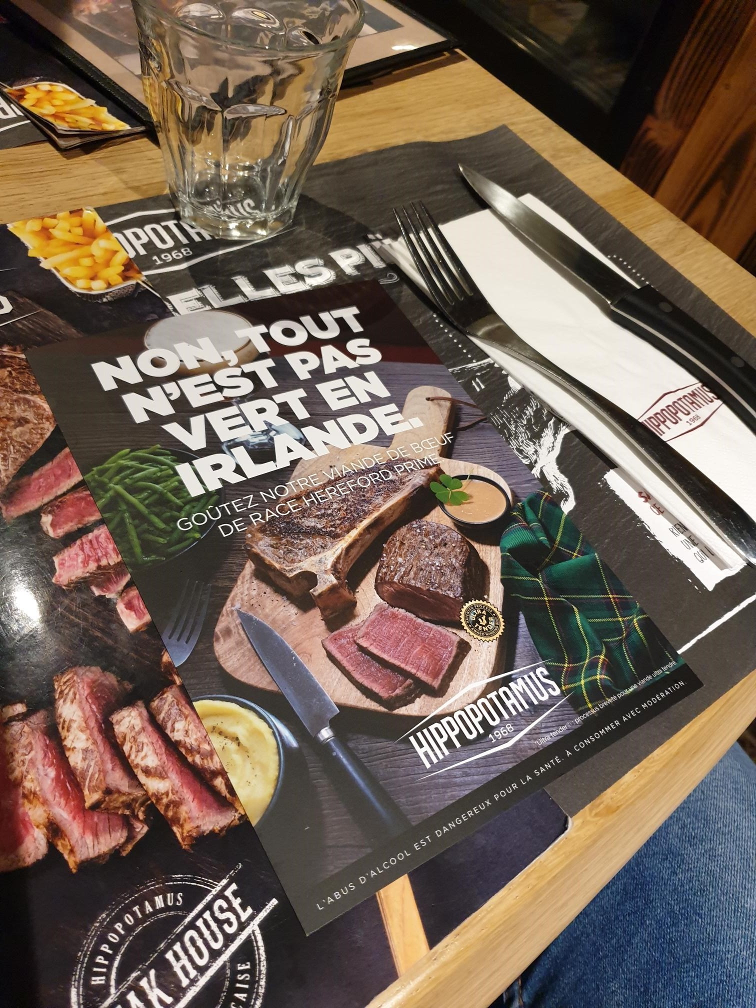 J’ai été à nouveau invité à tester un plat chez Hippopotamus La Vigie… Ce coup ci, je suis parti en Irlande pour déguster une viande de race HEREFORD PRIME à l’occasion de la future Saint Patrick (le 17 mars) ! Je dois être honnête, je ne connaissais pas du tout ce type de viande, mais je me suis régalé : j’ai pris le pavé de 200g, et il était tendre, bien cuit, très facile à la mache et à la découpe… Rien à dire ! Accompagné d’une bonne bière Grimbergen ambrée et d’une sauce “irish” délicatement relevée, c’était parfait. Il me restait un tout petit peu de place dans l’estomac pour apprécier le “Irish Tiramisu” de circonstance en guise de dessert…