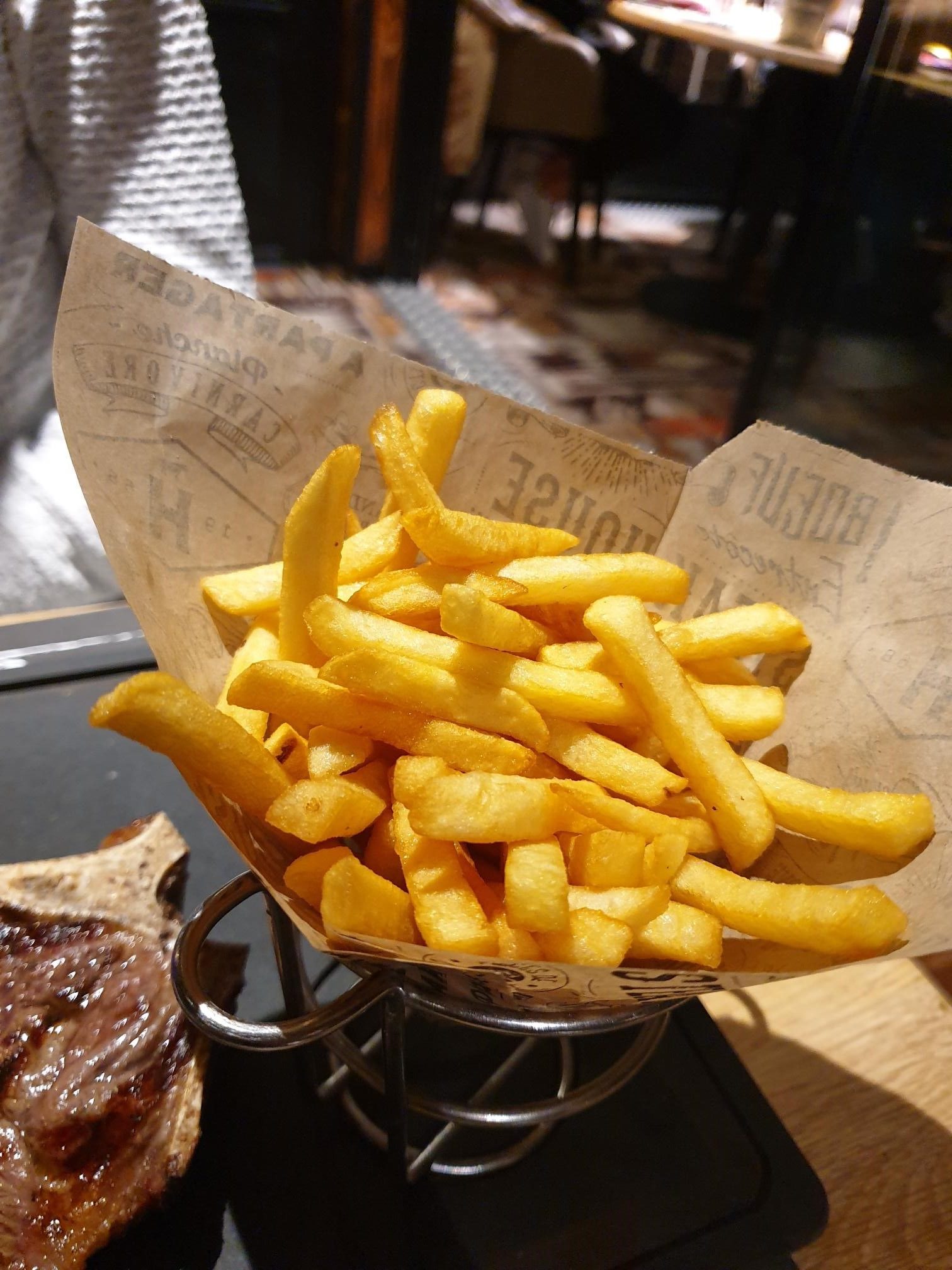 Côté prix, (environ 15 euros par assiette pour nous), j’ai trouvé que c’était un peu cher vu que les frites n’étaient pas à la hauteur et que ma bavette n’était pas non plus très grande et vu que on ne nous a même pas apporté leurs fameuses chips maison gratis (que j’ai dû demander avec insistance car j’adore leurs chips, elles sont trop bonnes) en apéro.