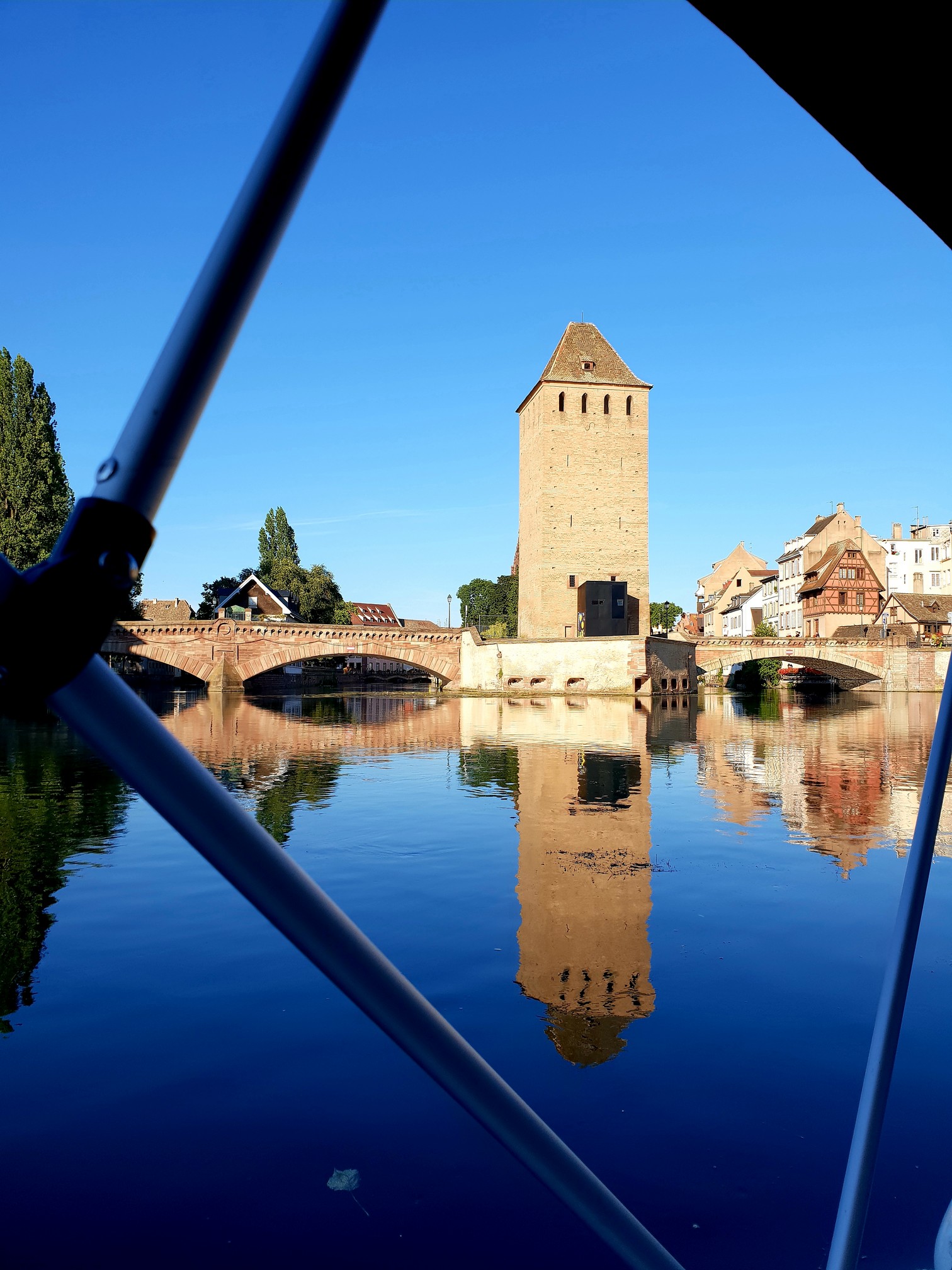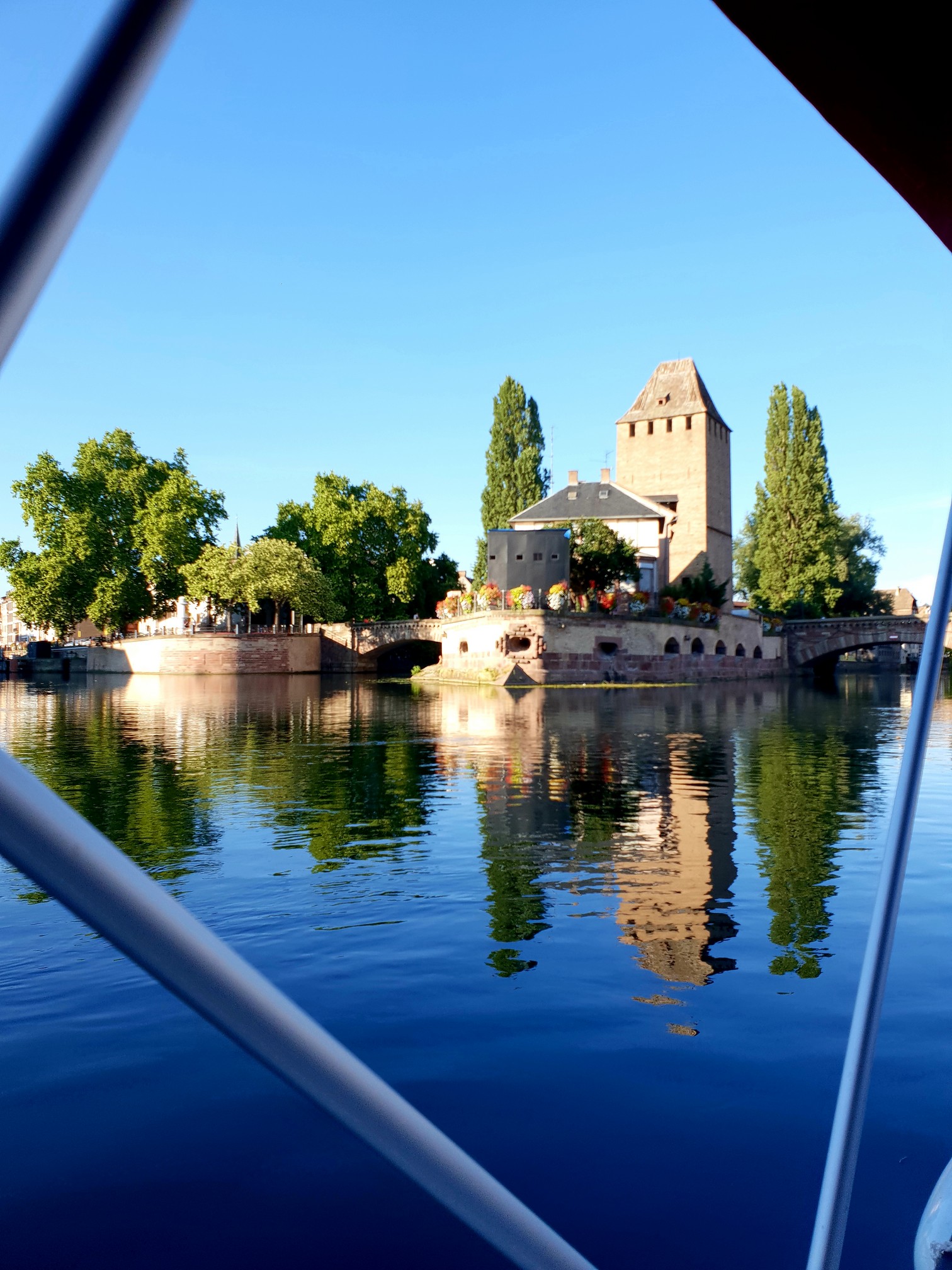 Arrivés à l’heure, on a attendu quelques minutes pour avoir notre bateau et après quelques explications assez sommaires, on embarque. Tout d’abord, mauvaise surprise avant de partir : on ne peut pas faire le circuit “historique” de Strasbourg car les écluses ferment à 18 h ! Dommage, c’est ce que je voulais ! Devant le fait accompli, j’ai dit OK malgré tout, et on est partis sur un itinéraire par défaut : l’itinéraire “nature” qui nous emmène direction L’Ill, Musée d’art moderne, Montagne Verte, Ostwald. J’aurai aimé être prévenu avant de choisir l’horaire, j’aurais réservé à une autre heure… Bref.