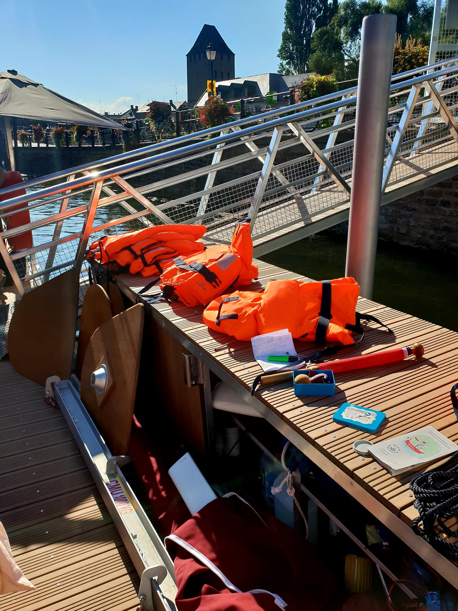 Ayant peur de la disponibilité, j’ai réservé sur la place la veille. Je suis parti sur un horaire en fin de journée pour éviter de cramer sur le bateau vu la canicule actuelle. J’ai donc payé en amont 40 € pour un bateau de 1 à 5 personnes pour une heure, un dimanche soir à 18h. La caution, non encaissée, était de 300 €. Nous étions 4, et nous avions prévu de prendre un apéro tranquille sur le bateau et profiter de la vue strasbourgeoise.