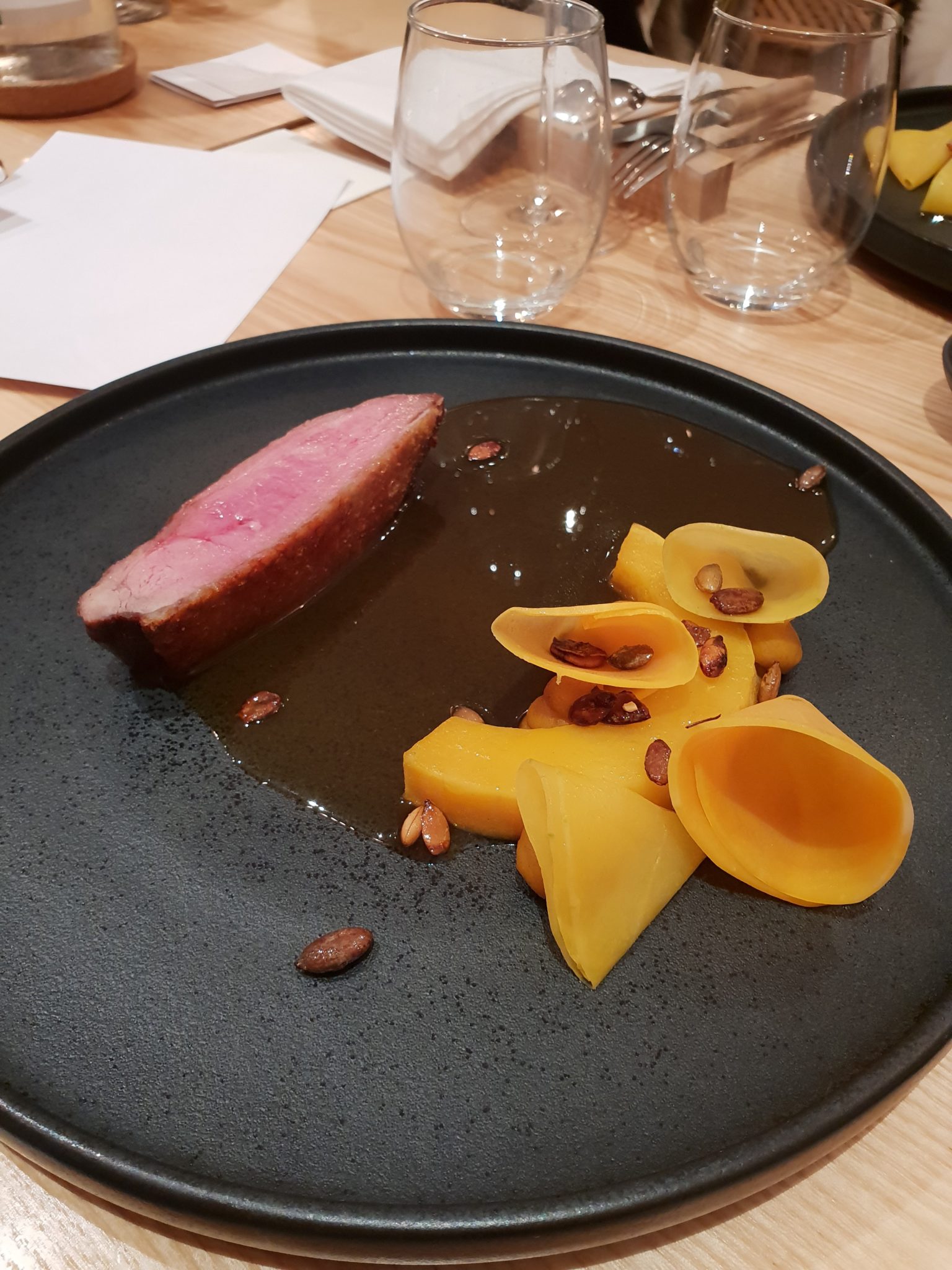 En plat du veau avec courge butternut, cazette et whisky. Un petit pré dessert enfin pour terminer un glace vanille gingembre avec caramel beurre salée et pop corn.