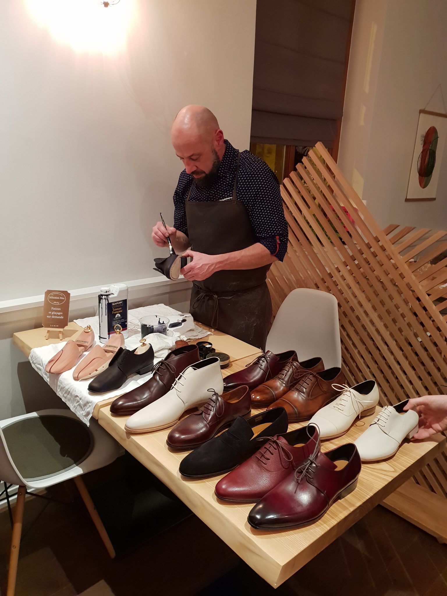 Mais avant de commencer le repas, on a pu découvrir une autre marque :  Il s’agissait de la marque de souliers sur mesure Luxin. C’est une marque de souliers fabriqués en France et personnalisables présentés par la Cordonnerie Sébastien Mas de Strasbourg (seul point de vente de la marque Luxin dans la région) qui nous fait sa démonstration de patine et de cirage de souliers (façon pro !).