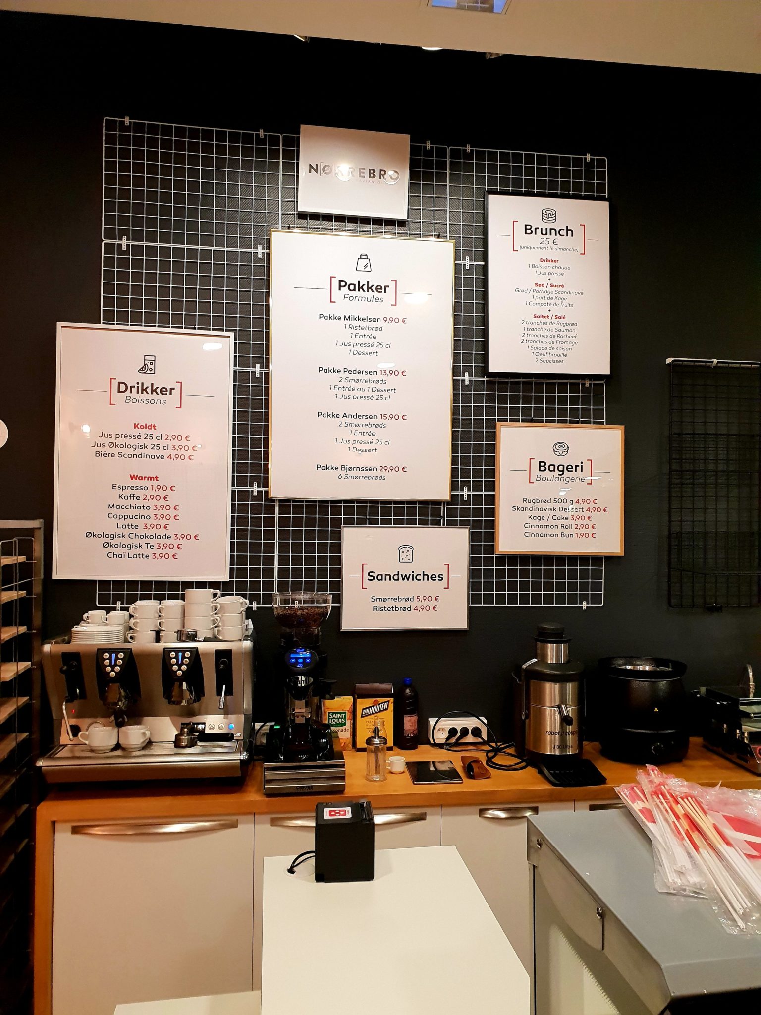 Nørrebro, c’est avant tout le nom d’un quartier de la capitale danoise : Copenague. Ce quartier a servi d’inspiration pour son mode de vie hygge et sa gastronomie pour les créateurs de la boutique. Ici on va donc pouvoir manger des Ristetbrød ou encore des Smørrebrøds (petites tartines colorées avec une base de pain de seigle) accompagné de jus de fruits pressé avec une entrée et un dessert (par exemple).