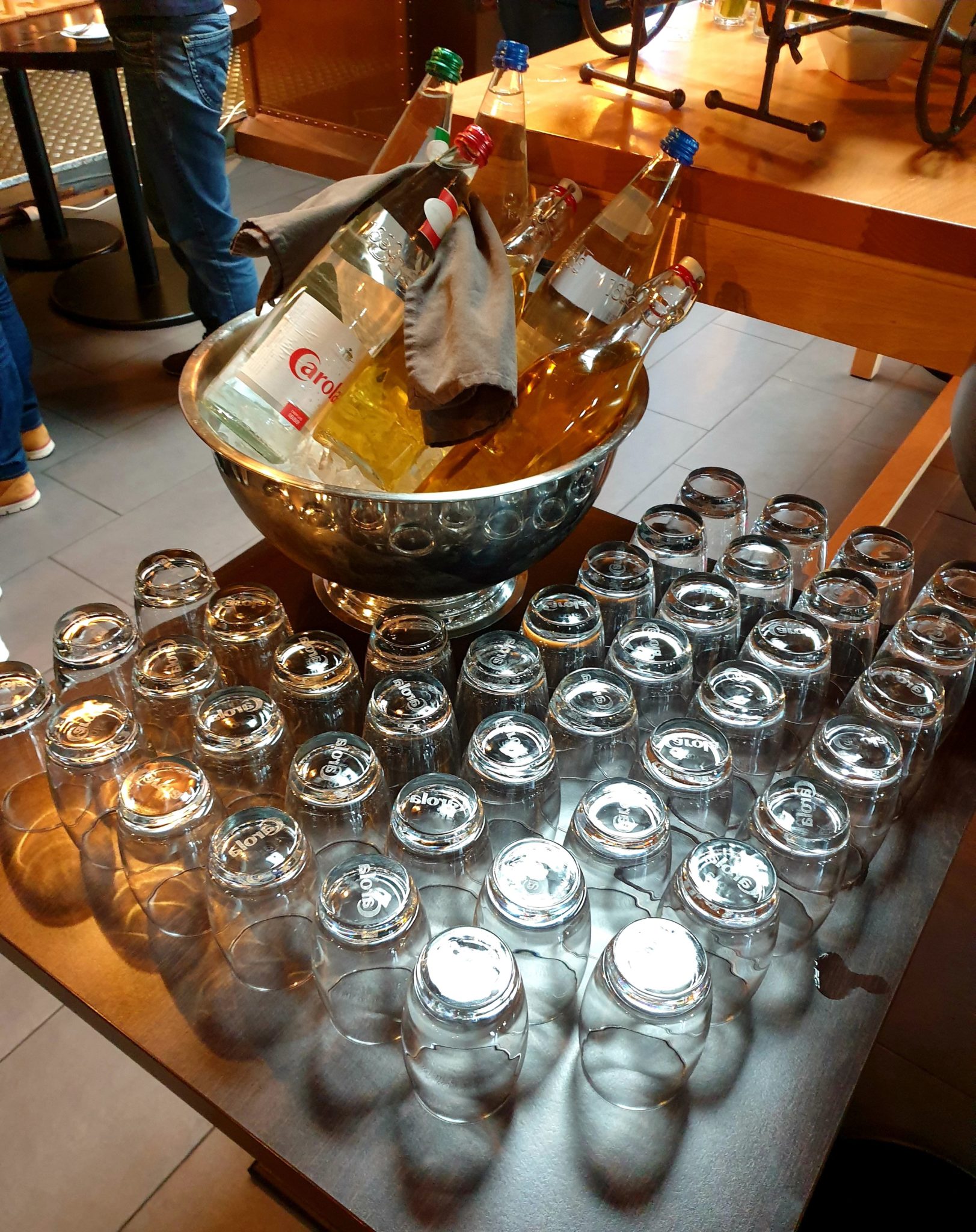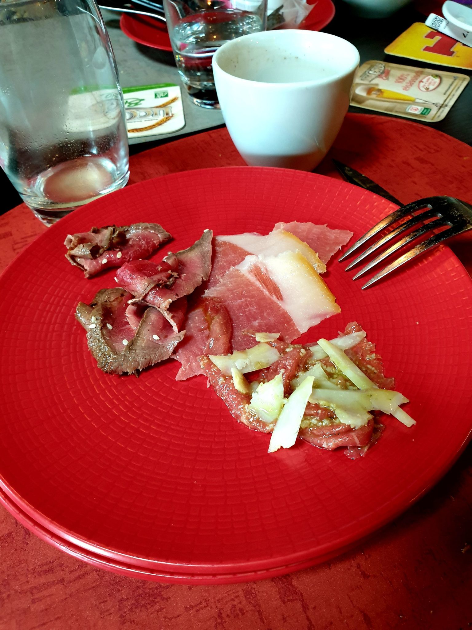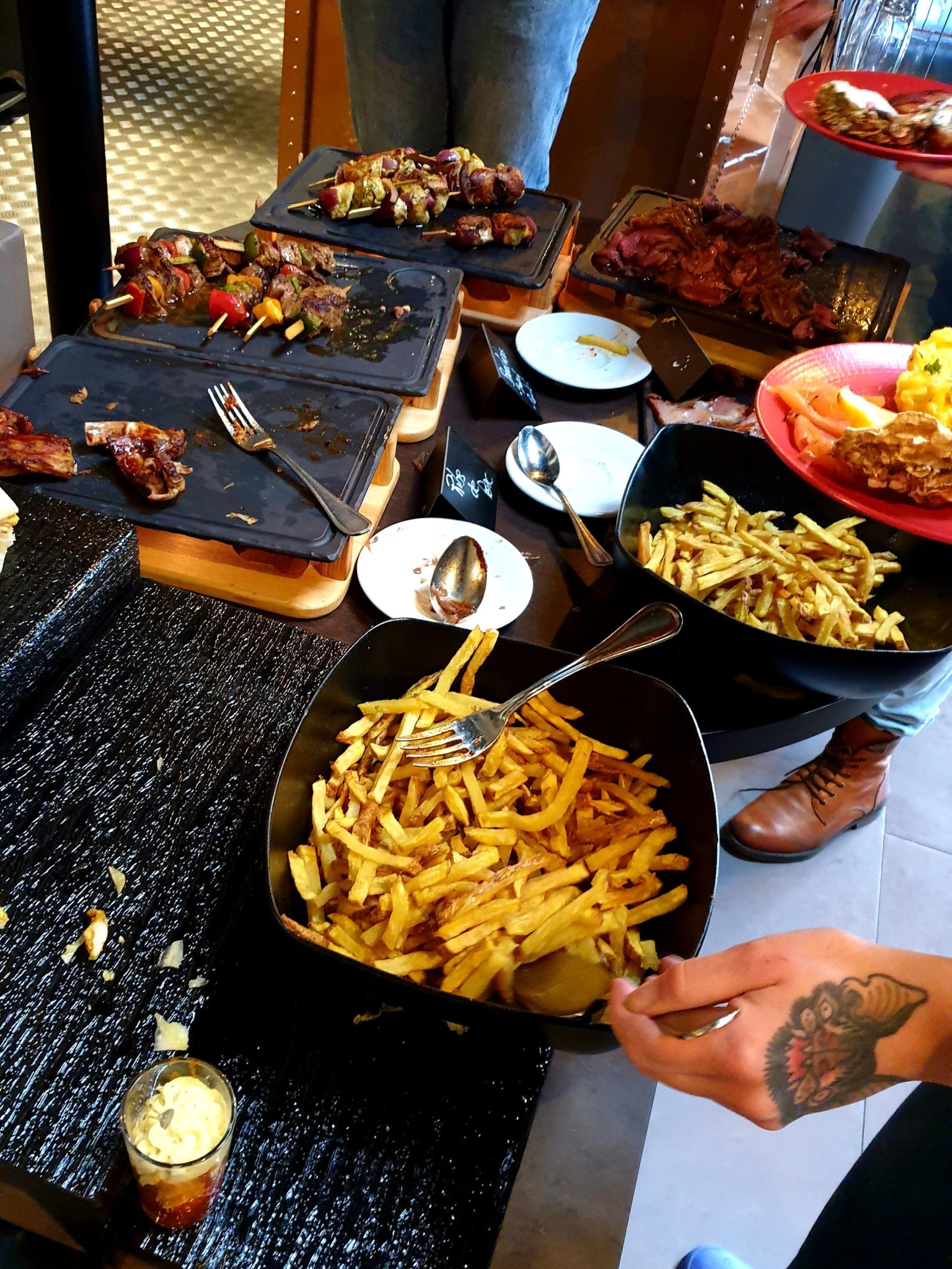 Mais il y avait surtout différents plateaux de viandes (spécialité de la maison, comme le nom du restaurant l’indique !) : Carpaccio de bœuf, saumon fumé, mini hamburgers, onglet à l’échalote, brochettes de bœuf ou de poulet, jambon Serrano à la découpe et où encore même des huîtres !