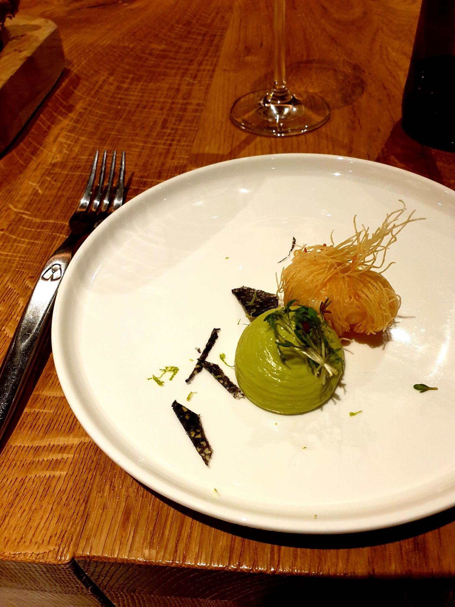 Hum, le tapas qui me fait de l’oeil, et que je mangerai avec grand plaisir, c’est celui au pesto ail des ours-gambas en kadaïf-guacamole. 😁
