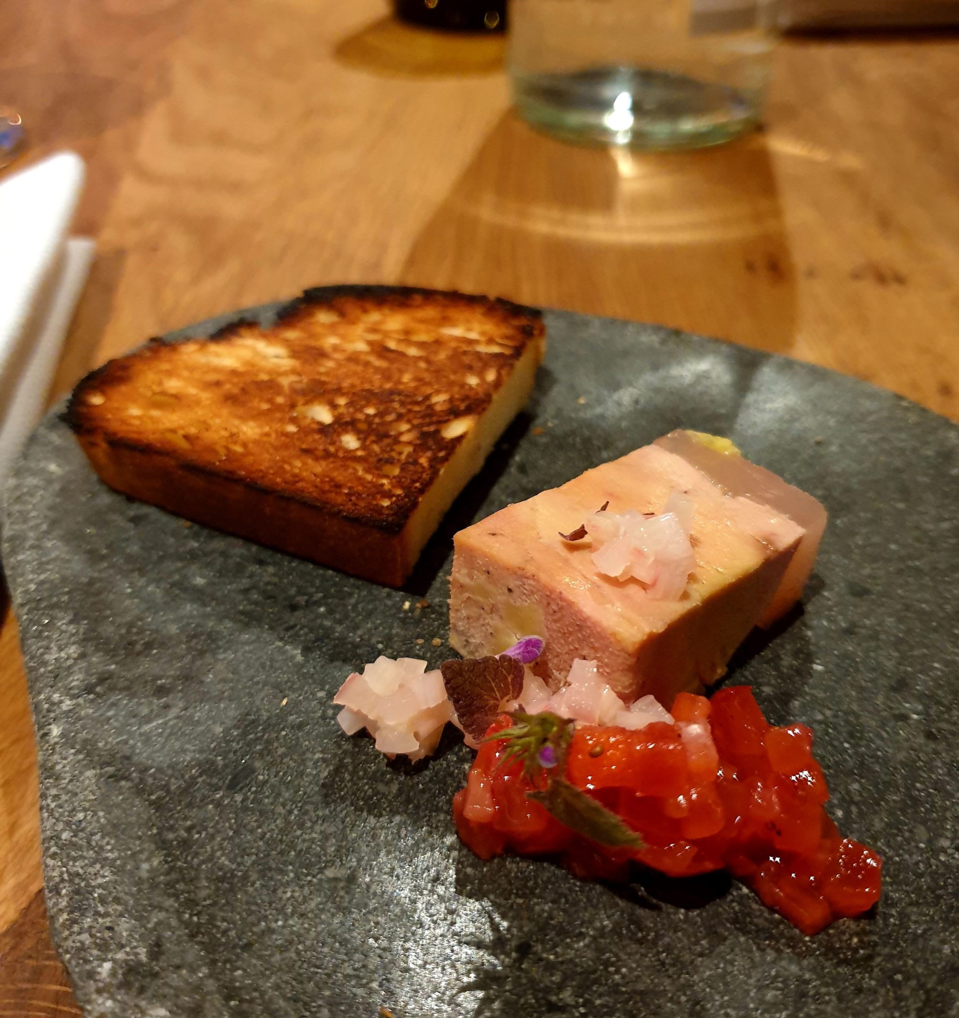 Fois gras de canard rhubarbe et fraise sans hésiter.