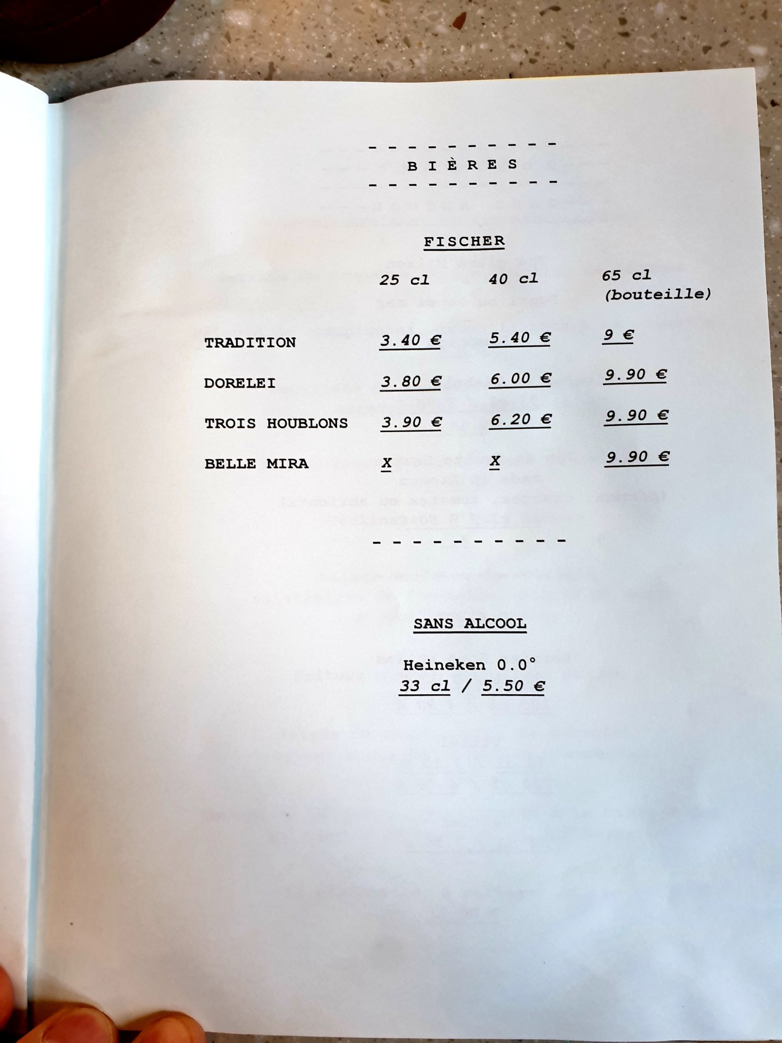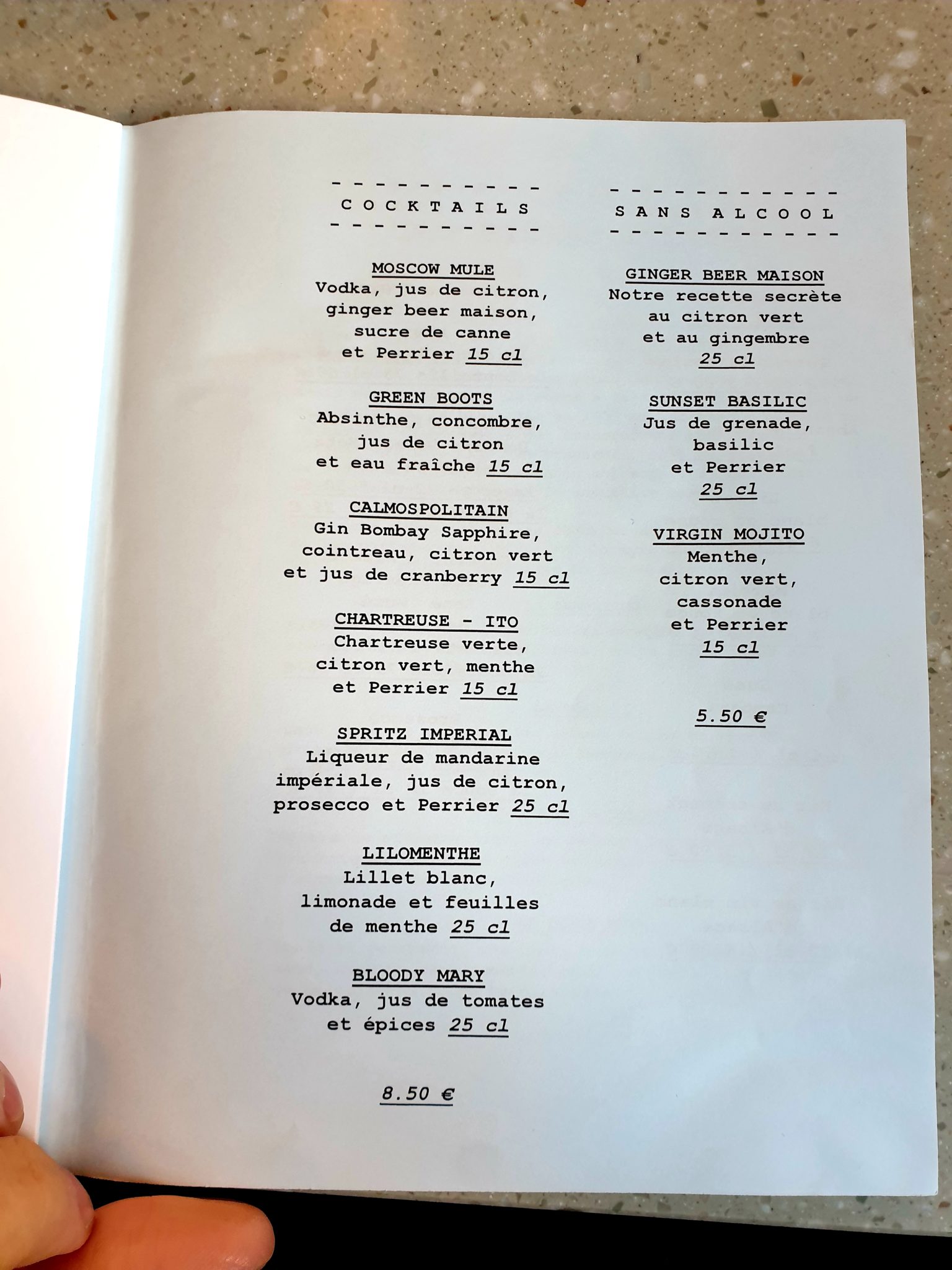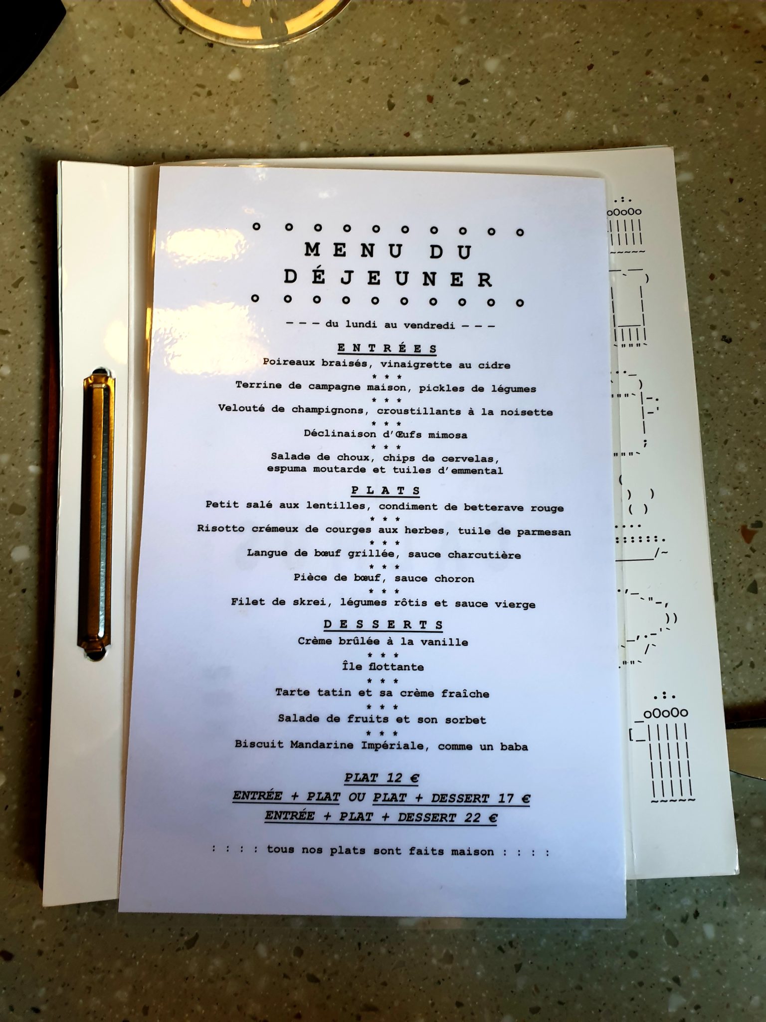 C’était un midi de semaine, le soleil tapait fort sur Strasbourg mais l’air était encore frais pour ce mois d’avril. Etant donné que j’aime bien les autres restaurants du groupe, il me fallait tester le petit dernier. J’ai donc réservé une table pour deux pour la formule midi. Je m’installe en haut et vu que les portes ouvertes était ouvert en bas, et de même pour les fenêtres en haut, il y avait un sacré courant d’air : j’ai gelé en quelques minutes… Le temps d’analyser le menu et d’attendre l’arrivée de ma co-luncheuse, j’ai pu fermer les fenêtres et me réchauffer. J’ai regardé rapidement la carte et je me suis rabattu sur la formule du jour : entrée + plat + dessert à 22 € (il est aussi possible de prendre les 3 éléments séparés ou combinés).