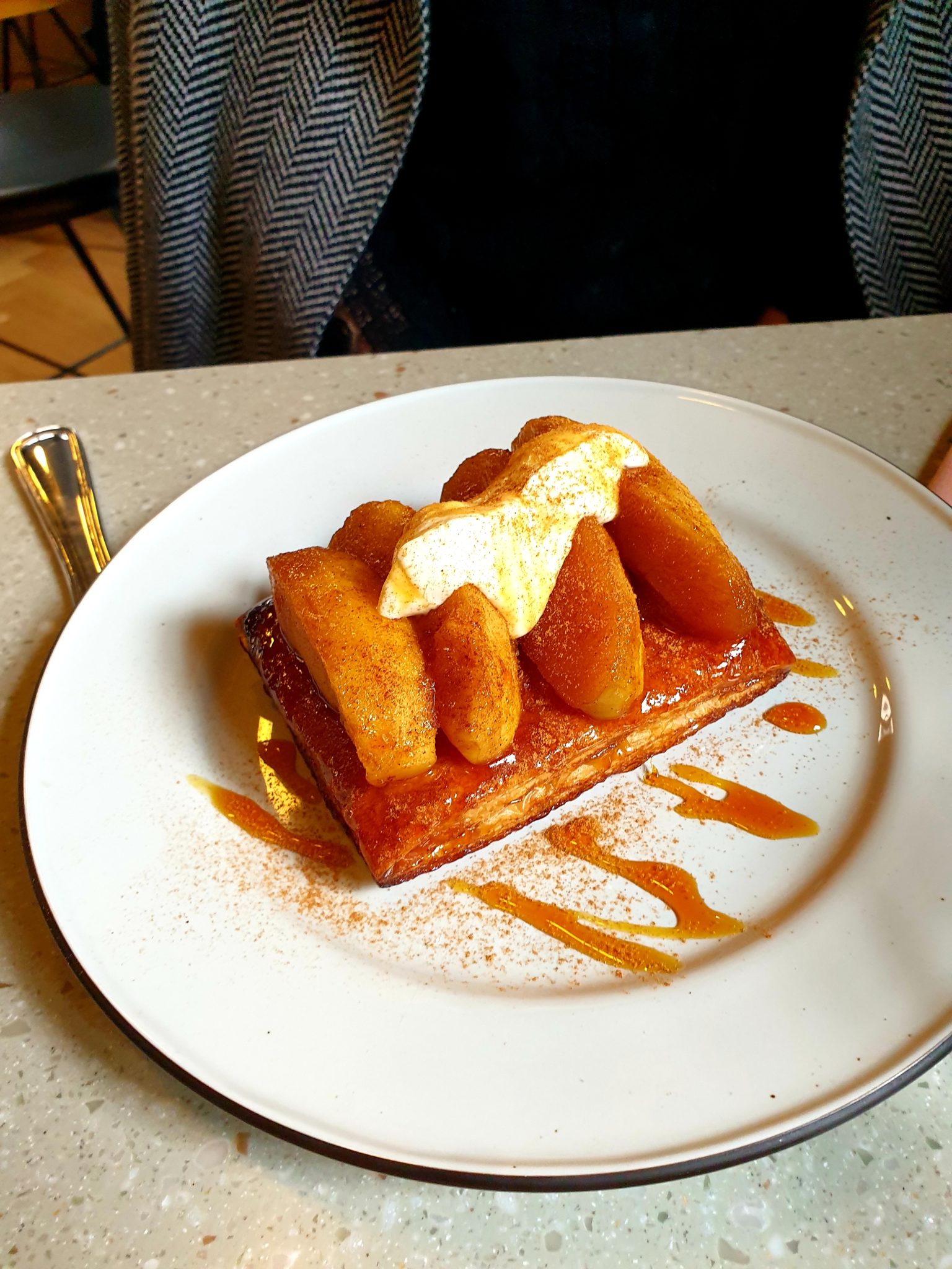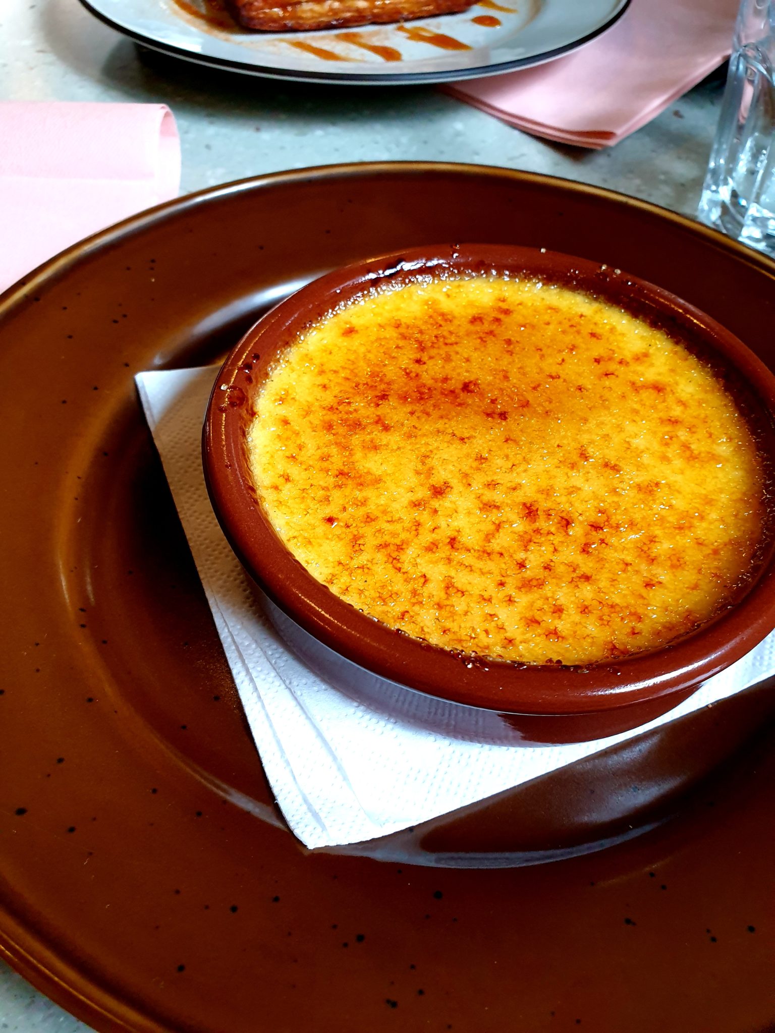 Pour finir, par une crème brûlée à la vanille et une tarte tatin et sa crème fraîche en desserts. Le service était un peu long par moment mais a bien rattrapé son retard vers la fin donc pas de soucis. On a pu profiter de l’ambiance sympa du lieu, avec des cartons de bureau multicolores au mur et les fauteuils rose poudrées…