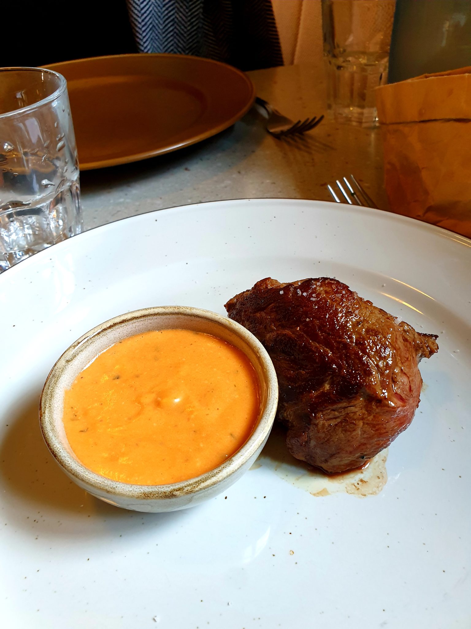Au niveau du cadre et du service rien à dire… Cependant pour les plats, j’ai été un peu déçu : les entrées étaient très légères dans la quantité. Pour les plats : la pièce de bœuf parfaitement cuite comme je le souhaitais mais accompagnée de frites industrielles basiques (je les ai pas finies); quant au petit salé, on a été aussi surpris par le choix de la viande, même si la présentation en casserole était plutôt originale. Pour finir, les desserts nous ont déçus : la crème brûlée est plus que simple et la tarte tatin avec une pâte feuilletée trop cuite nous a pas trop emballée… Du coup, je reste une touche un peu moyenne pour ce Calmos, du moins pour sa formule du jour. J’espère que le reste de sa carte vaut le coup… Pour finir, au niveau prix, on en a eu pour 51 € pour 2 avec les 2 formules, une grande bouteille d’eau et un café : un peu cher, non ?