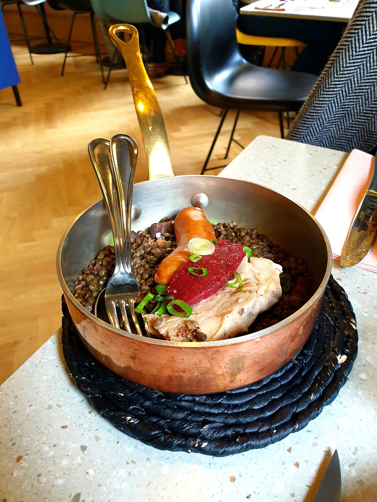 Puis un petit salé aux lentilles, condiments de betteraves rouge et une pièce de bœuf, sauce choron en plats.