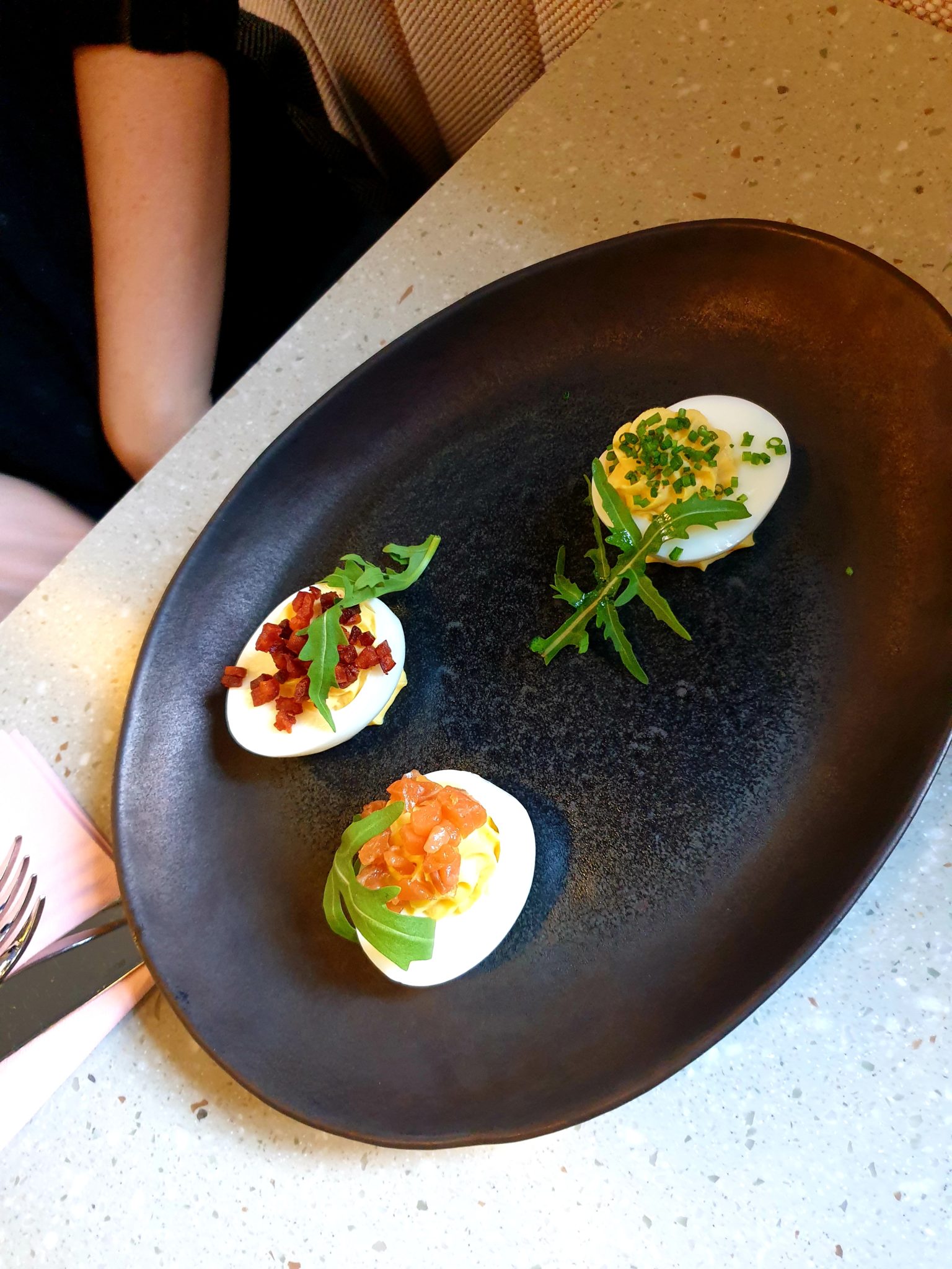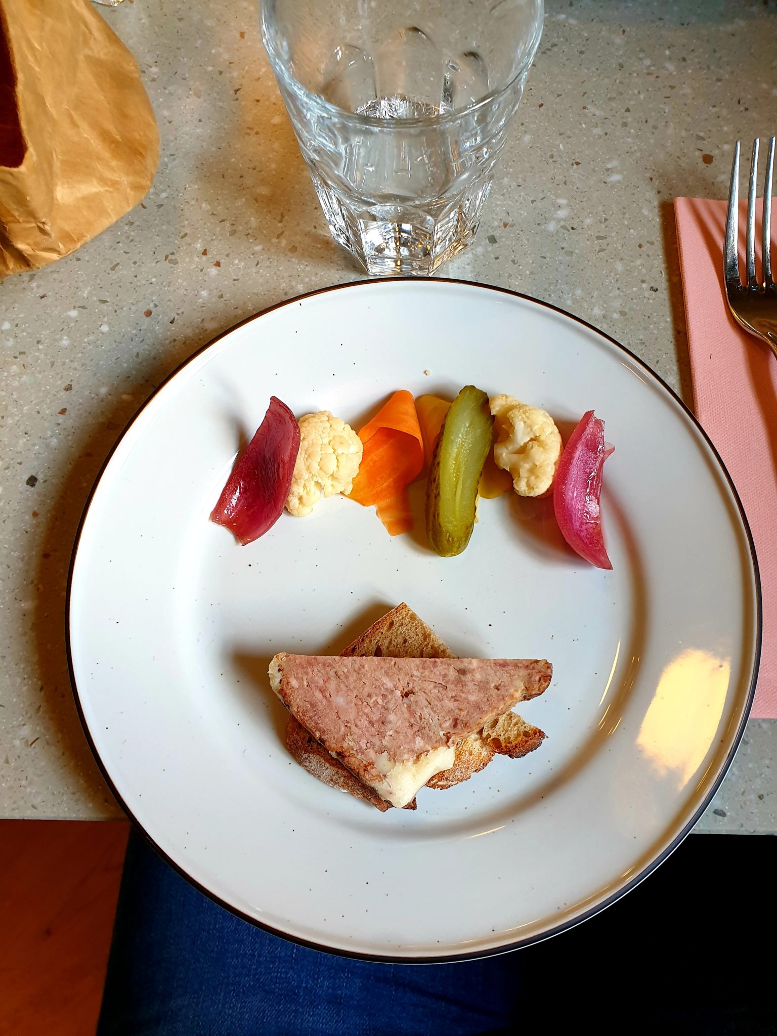 On avait 5 choix pour les entrées, idem pour les plats et idem pour les desserts : ce qui est très rare dans ce genre de formule, en général, c’est plutôt 2 choix ! On est partis donc sur la terrine de campagne maison avec pickles de légumes et une déclinaison d’œufs mimosa pour les entrées.