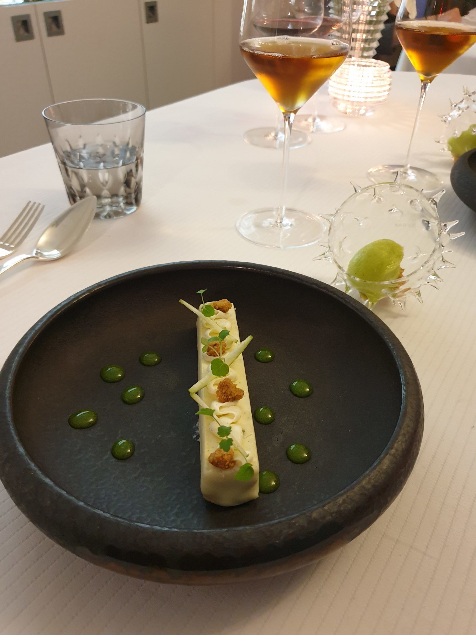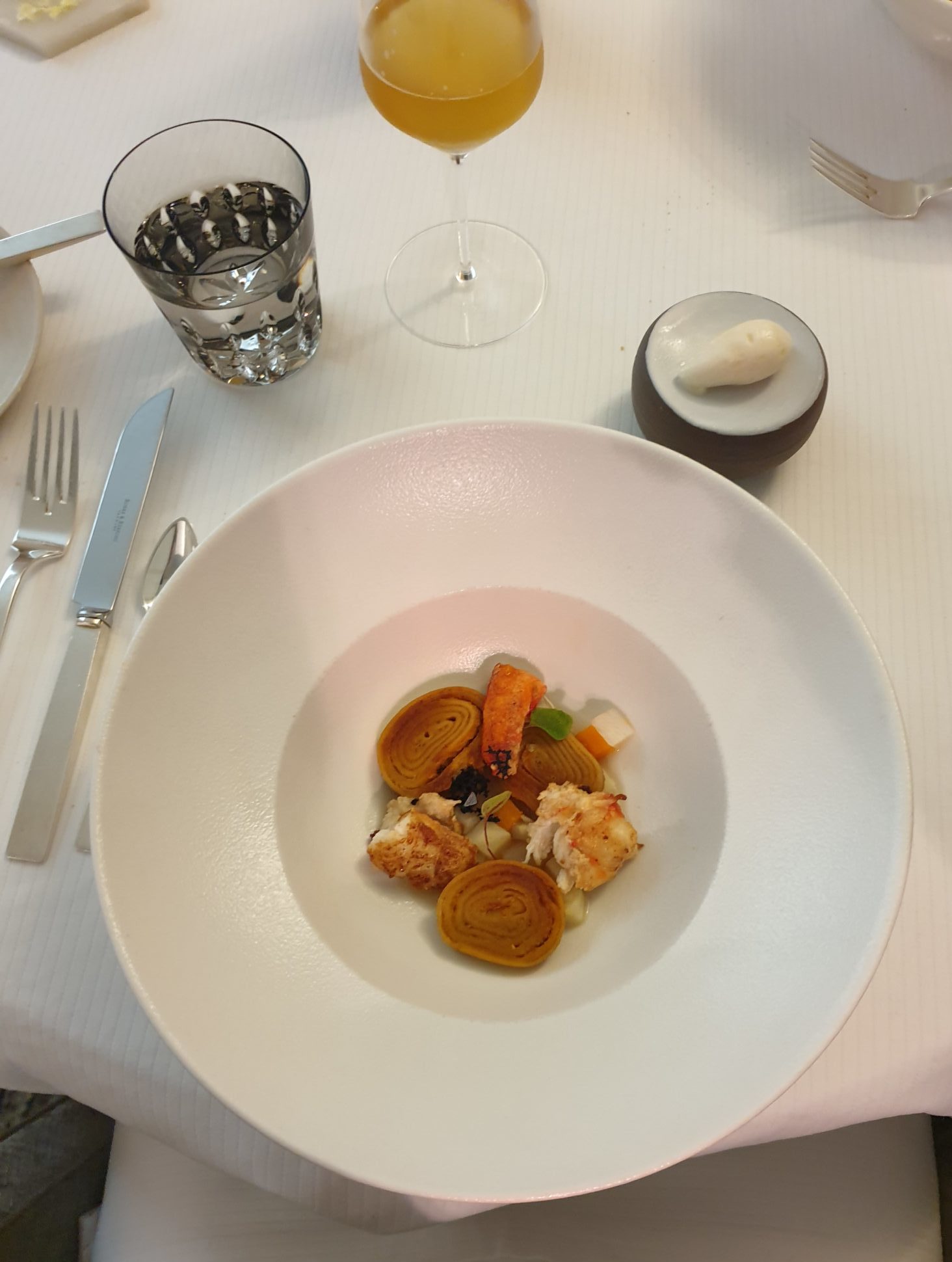 Comme je vous le disais plus haut, nous avons commandé un menu Découverte(s). Ce menu est servi pour la table entière. Nous étions deux, nous avons donc découvert les plats les plus fins, les uns que les autres au fur et à mesure de leurs arrivées. Je ne détaillerais pas ici les vins qui accompagnaient chaque plat (car je n’y connais pas grand chose) mais je vous rassure tous étaient à la hauteur !
