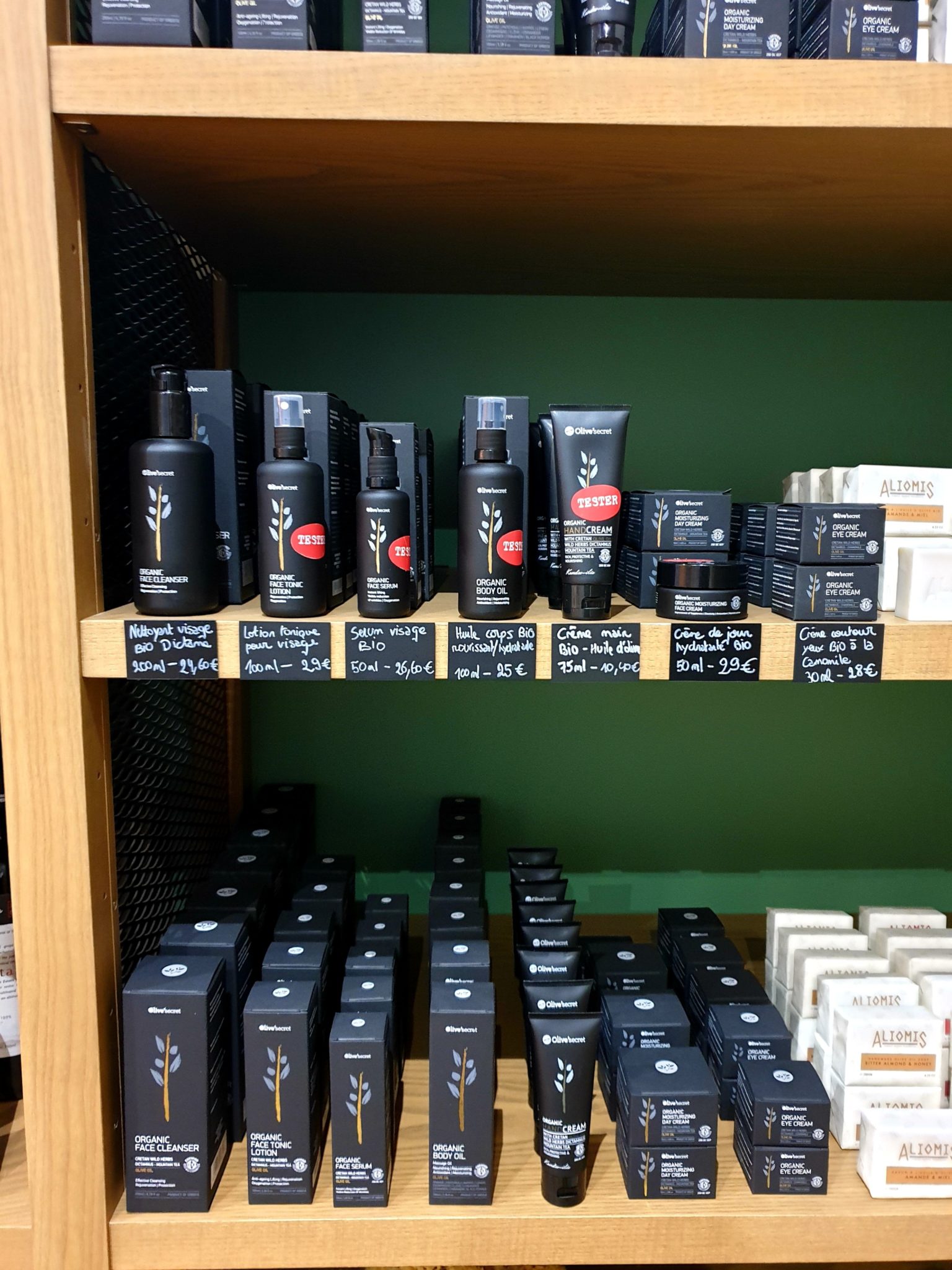 Niveau choix : on trouve chez Aliomis des huiles d’olives (20 références, dont la meilleure huile olive 2018 : Kyklopas), des olives de toutes variétés, feuilles de vignes, tapenades et fetas entre autres. Mais on trouve aussi des cosmétiques, du safran et des thés grecs: en tout 200 produits venant de Grèce donc 1/3 certifiés bio. Soucieuse aussi d’aller vers un monde en mode “zéro déchet“, l’équipe souhaite aussi développer une offre de produits en vrac (pour le moment 30 références déjà disponibles au fond de la boutique).