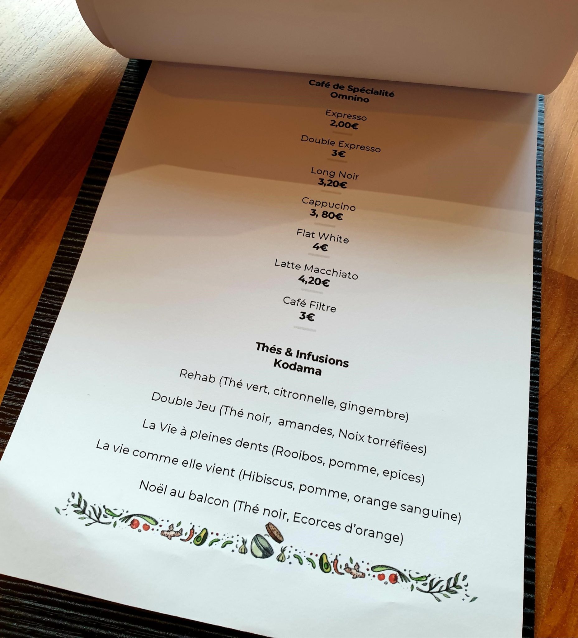 Nous y étions pour le repas du midi, un samedi. La salle était pleine, donc impossible de réserver. Le serveur m’a proposé de m’envoyer un sms quand une table se libérerai… Pratique, car un bon quart d’heure plus tard, le sms arrivait et ma table m’attendait. L’ambiance était plutôt sympa en mode cool avec des toilettes remplies de feuillages…