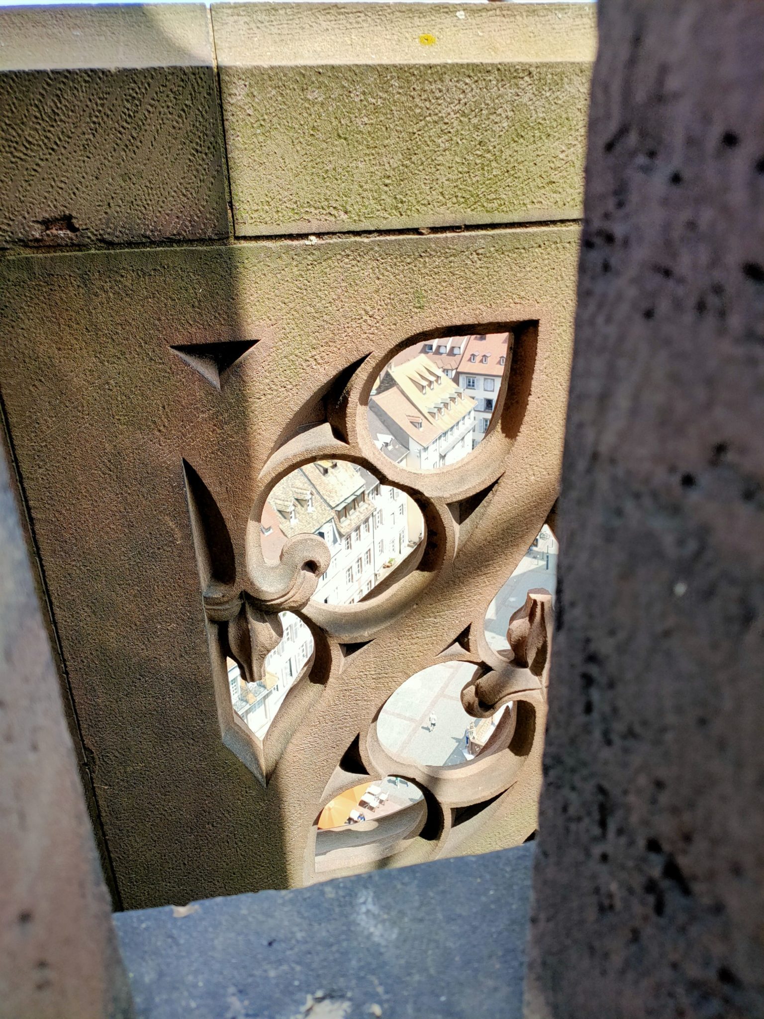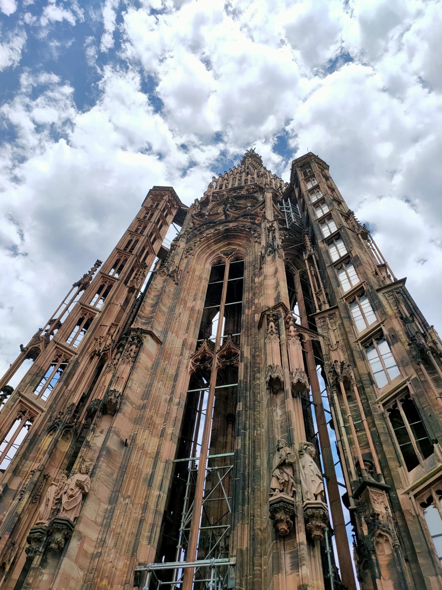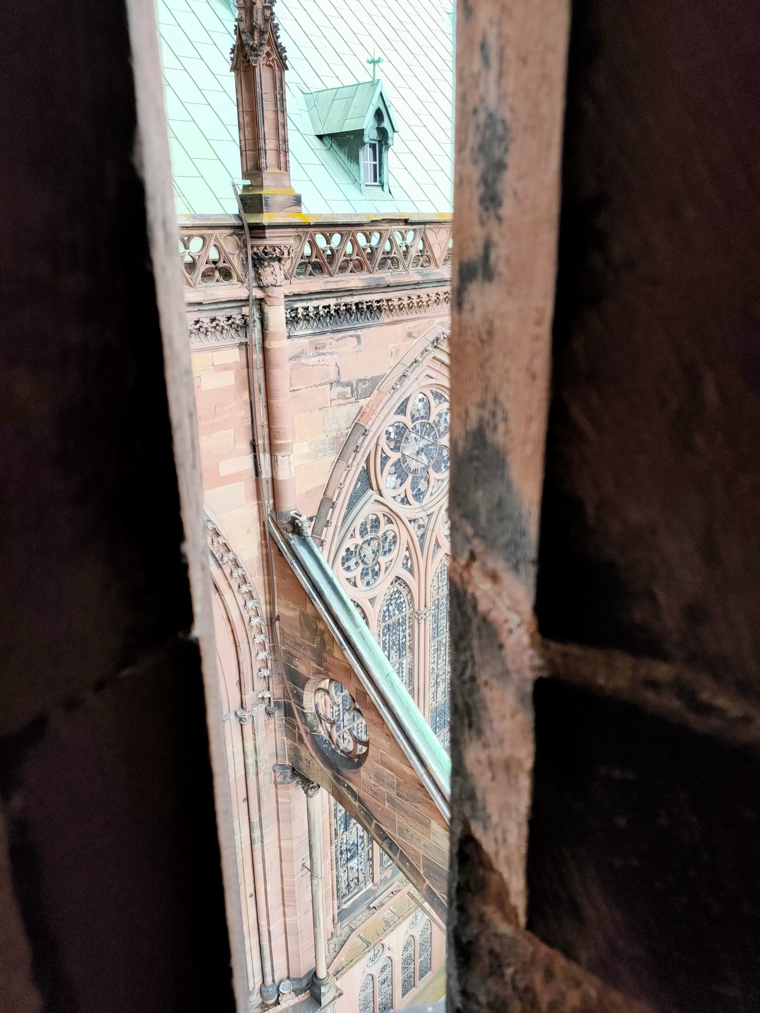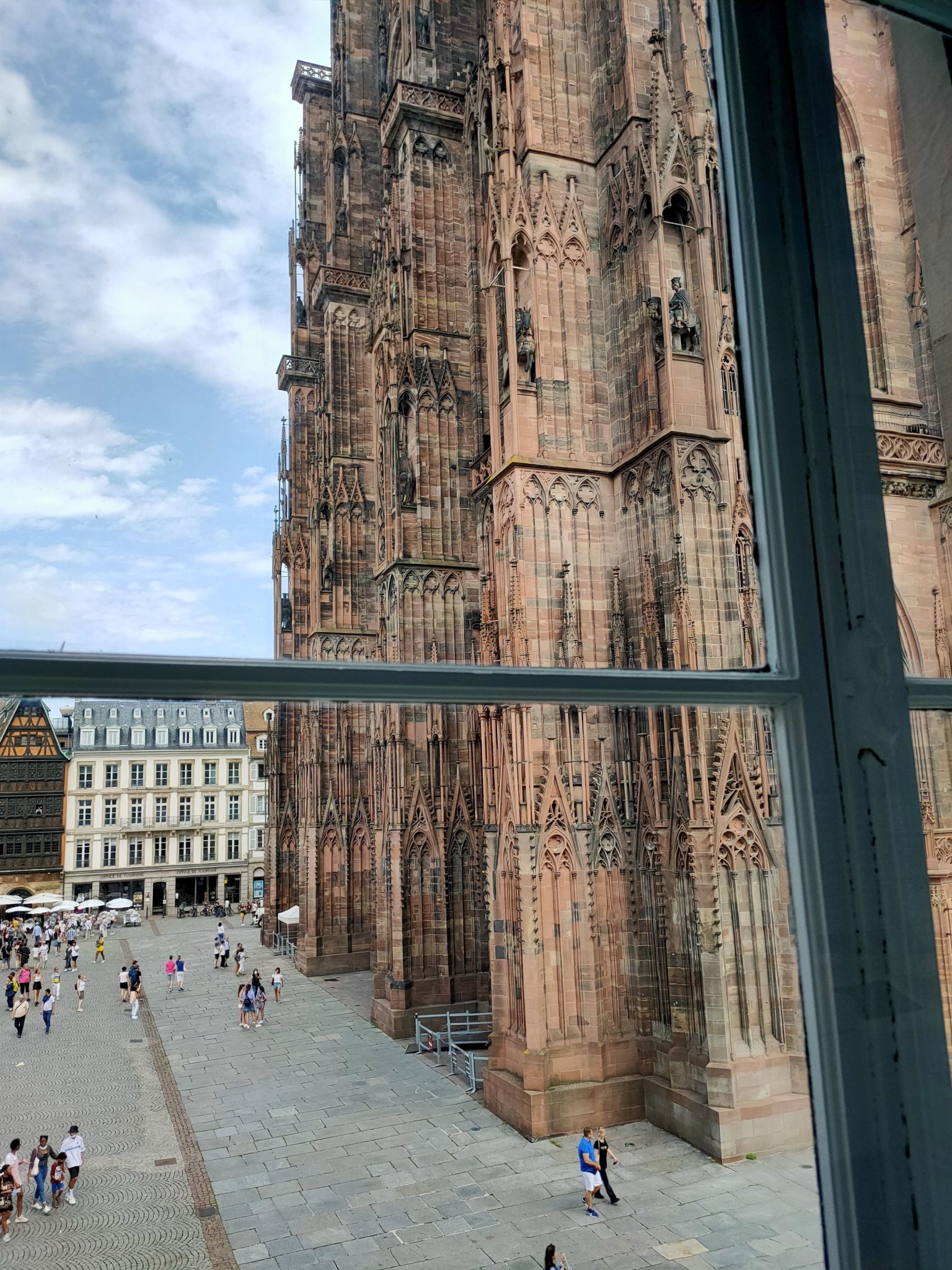 Cela faisait longtemps que je n’étais pas monté là-haut, je crois depuis le tournage du Défi des bâtisseurs où je faisais de la figuration… La montée est toujours aussi sportive, surtout sous 30 degrés ! Mais le bonheur est à la hauteur de l’effort quand on arrive en haut des marches… Toujours un émerveillement de voir sa ville vue de si haut ! J’ai fait le petit tour de la plateforme… J’ai presque reconnu tous les bâtiments strasbourgeois et j’ai pu tester l’application gratuite pour smartphones « VR Strasbourg Cathédrale » qui permet de faire un voyage dans le temps à 360 ° en comparant notre époque à celle de 1490 : Très impressionnant !