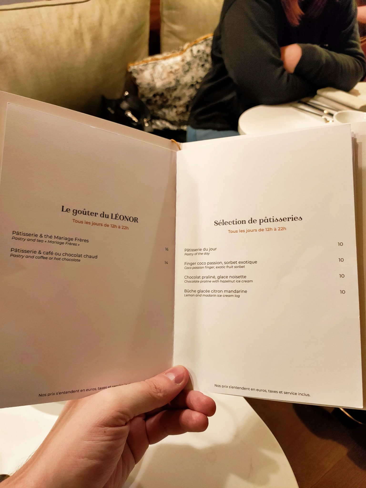 On peut manger en continu (carte « Anytime » servie de 12h à 22h) à l’hôtel Léonor : En cuisine, Nicolas Stamm et Serge Schaal (duo doublement étoilé à la Fourchette des Ducs à Obernai) vous proposent un concept chic et décontracté sur le pouce ou à la carte. Sans oublier la part belle faite à la pâtisserie avec la présence du chef pâtissier Matthieu Bray (qui a travaillé au Crocodile, Villa Lalique) qui veut réinventer le « tea time » en vous proposant des accords thés (Mariage Frères) – pâtisseries des plus surprenants ! A noter que les pâtisseries sont aussi disponibles en vente à emporter.