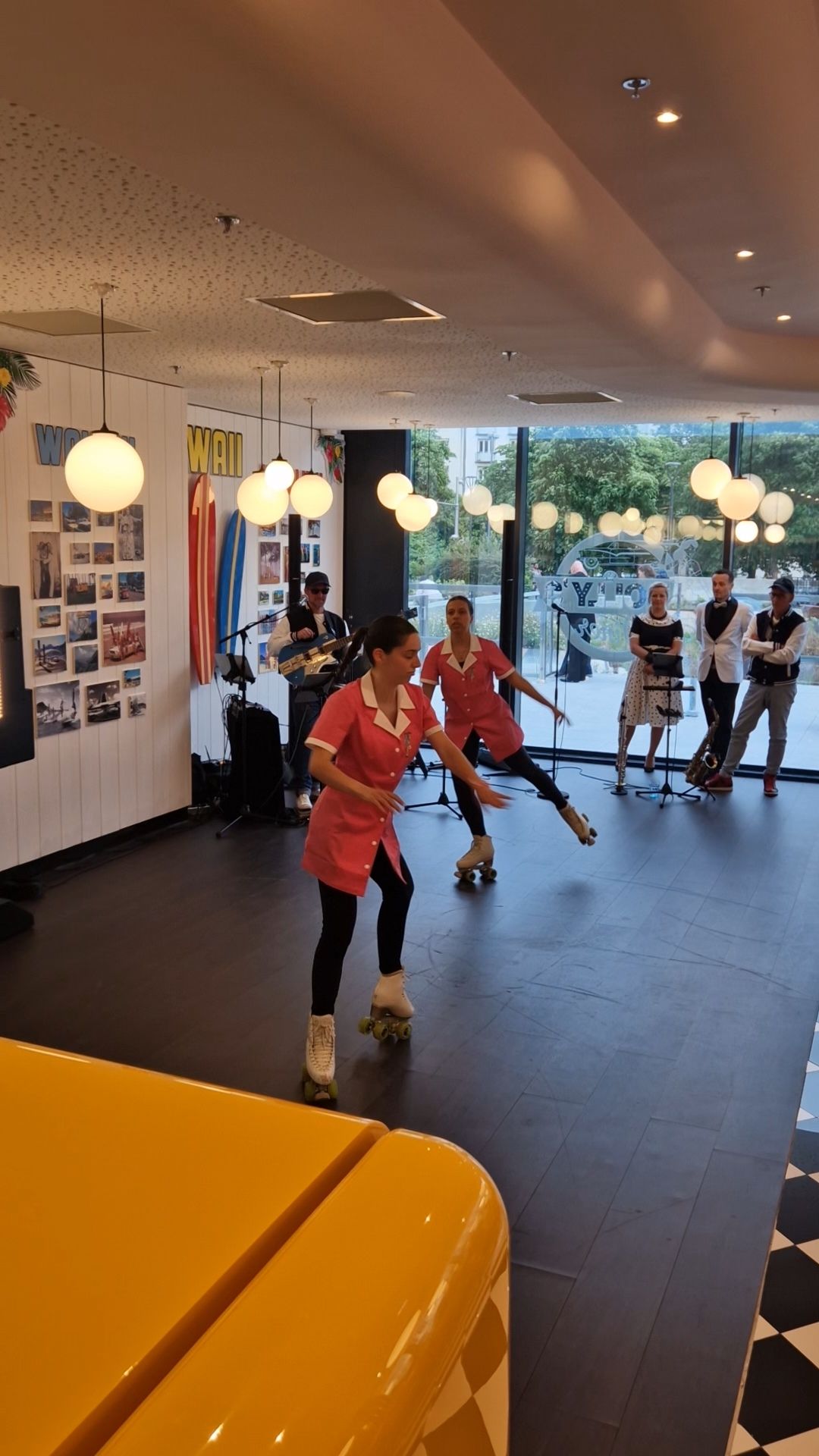 Dès l’accueil, une équipe souriante et dynamique vous guide… sur patins à roulettes. Oui, comme dans les diners d’antan ! Le service, assuré par près de 50 personnes, est fluide et efficace. Une vraie organisation bien huilée, même pendant une soirée d’ouverture.